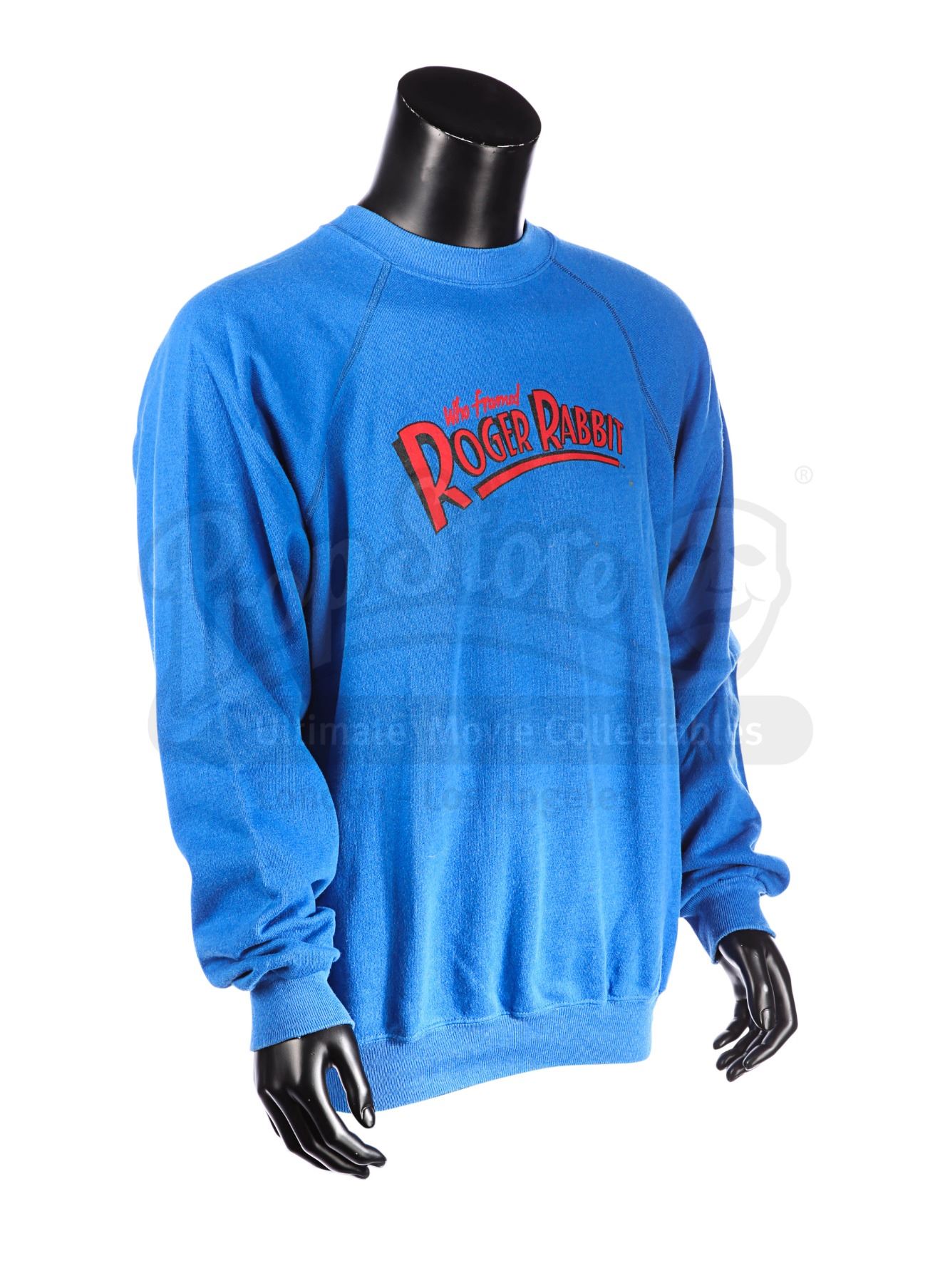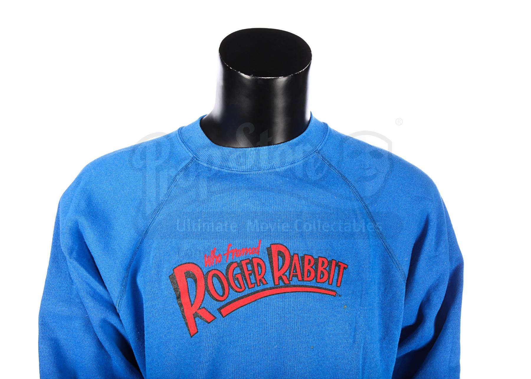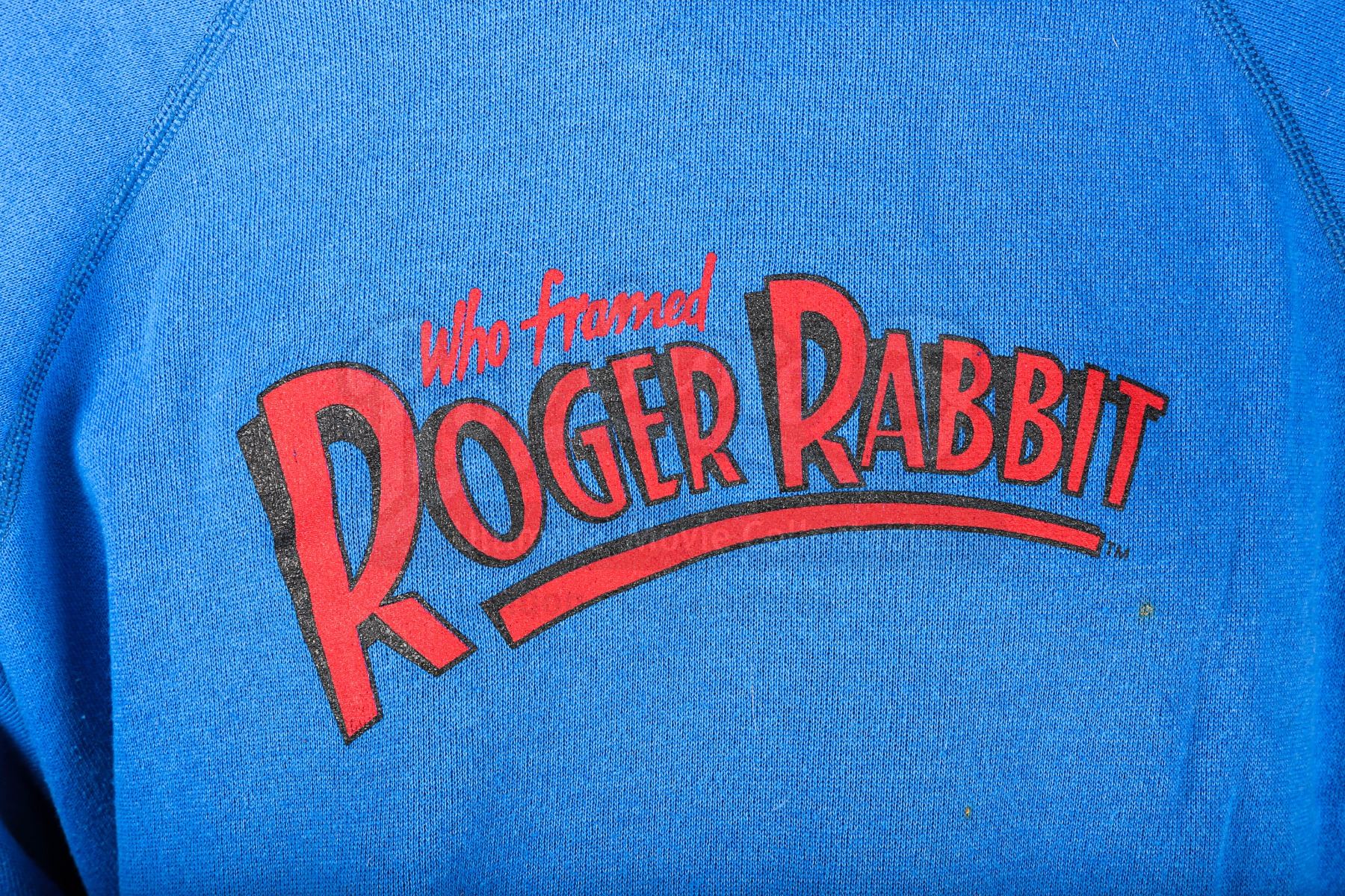 The three hard-back mounted posters depict film reel in the shape of Roger Rabbit and scenes from the film. The cap is made of white cotton, with a metal adjuster and "Roger Rabbit U.S. Unit" on the front. The three crew sweatshirts (sizes L and XL) are blue cotton and feature the film title in red on the front and "stay tooned€¦" on the back. The items show minor wear, the posters show water damage and various markings and the cap fabric has discoloured with age. Dimensions (Largest poster): 106 cm x 73 cm (45 1/2" x 28 3/4")