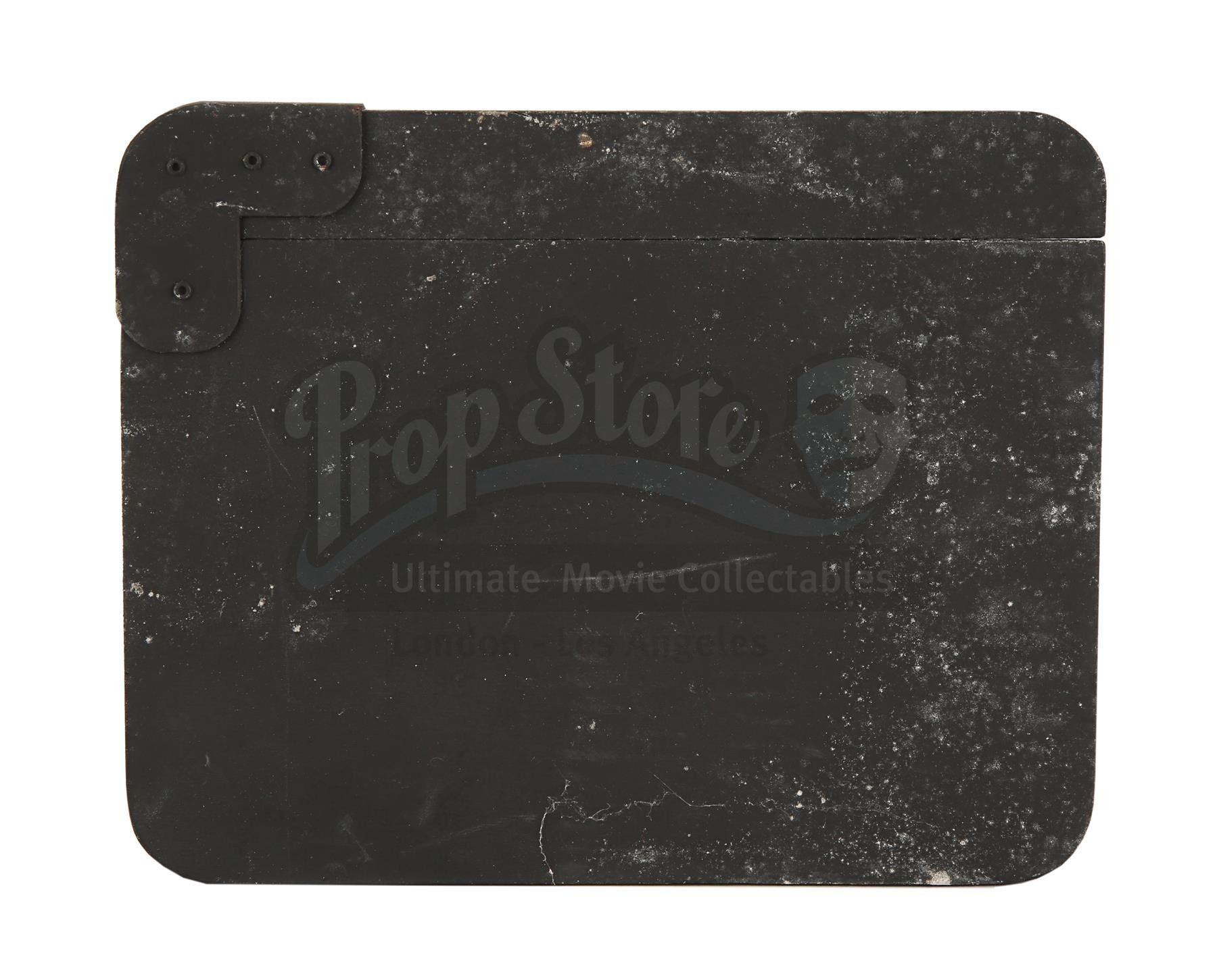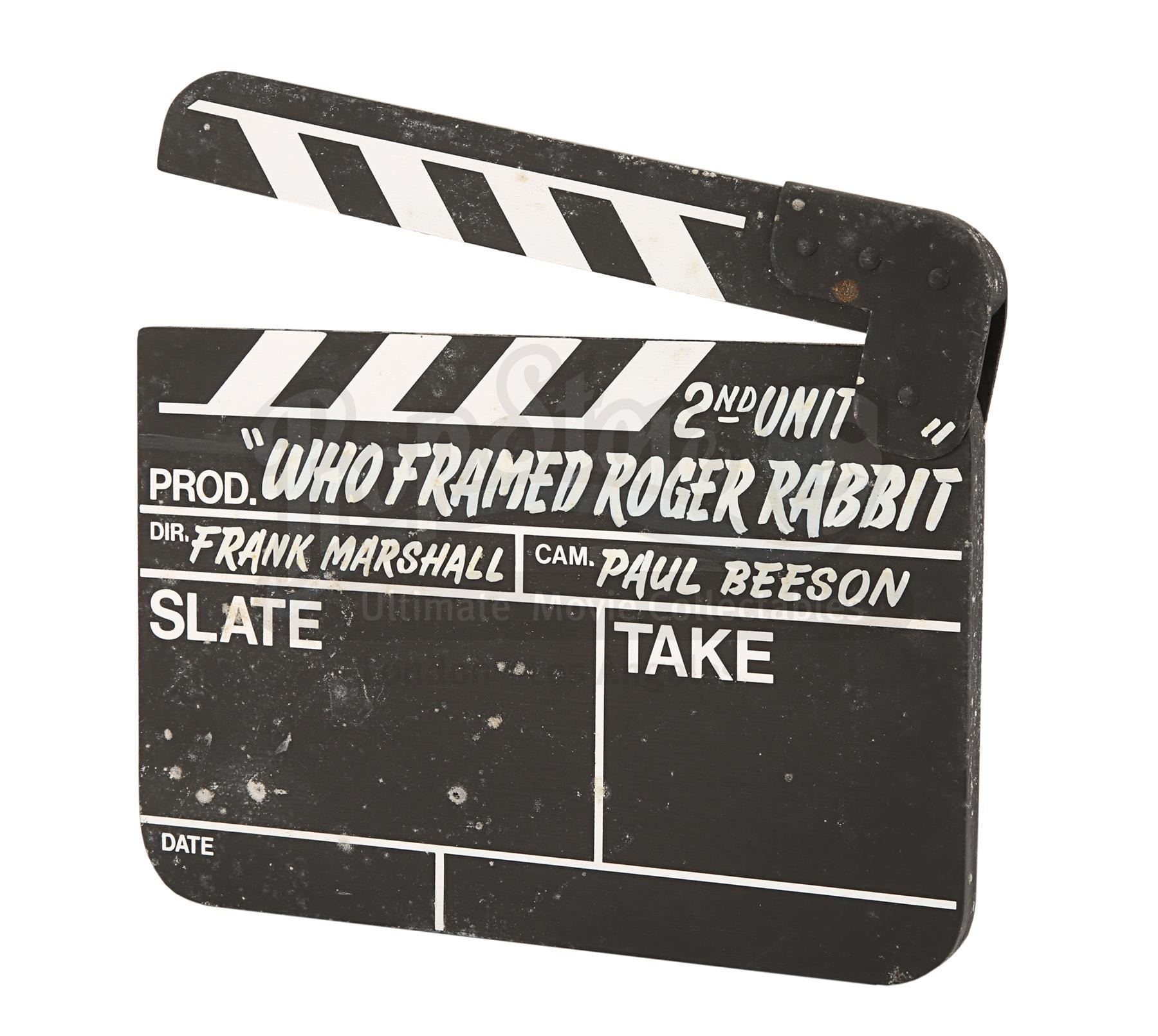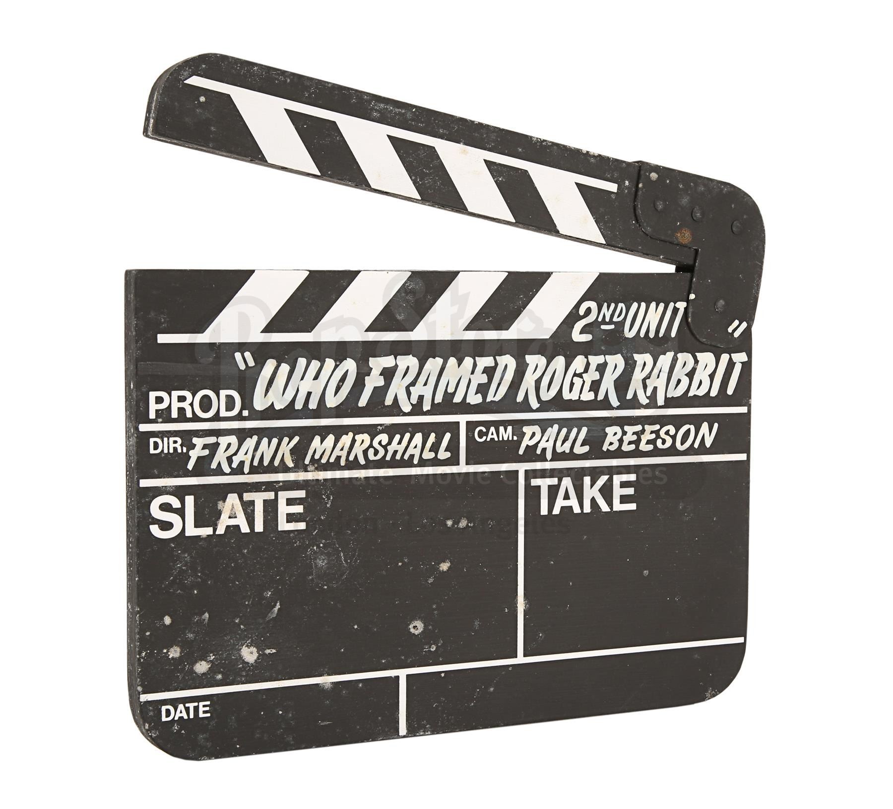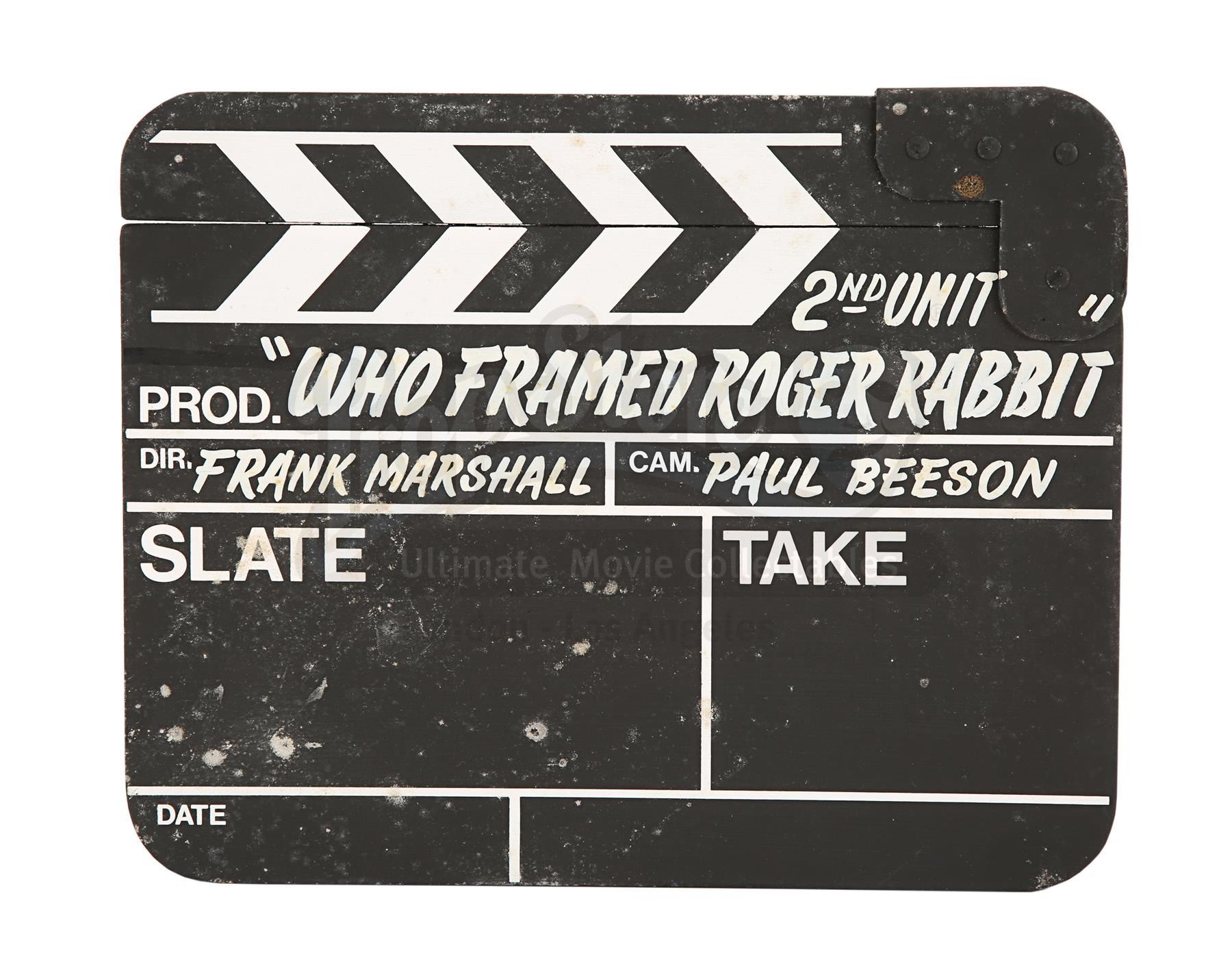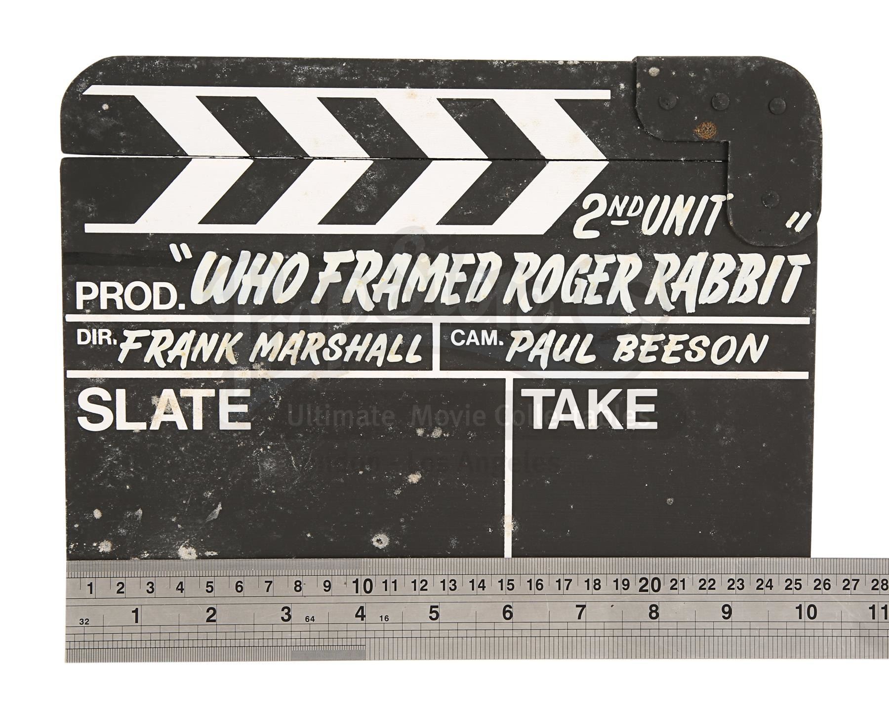 A production-used second unit clapperboard from Robert Zemeckis' Oscar-winning detective comedy Who Framed Roger Rabbit. This item comes from the personal collection of legendary producer Robert Watts. As well as being one of the film's producers, Frank Marshall also took the role of second unit director, and was responsible for shooting additional footage. This clapperboard was created for his second unit, which included camera operator Paul Beeson. It is made of black-painted wood, with the film's title and crew details applied in white paint. It shows signs of production use, with dust and dirt marks on the wood and metal hinge. Dimensions: 26 cm x 21 cm x 1.5 cm (10 1/4" x 8 1/4" x 1/2")