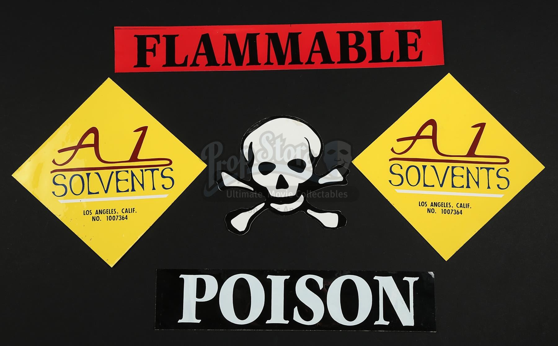 The dip stickers include two yellow square A1 Solvents stickers, a black-and-white skull sticker, a red rectangular 'Flammable' sticker and a black rectangular 'Poison' sticker.