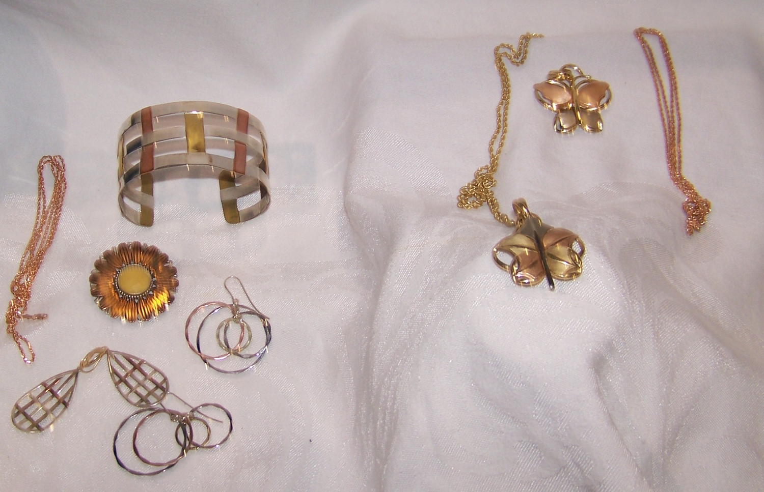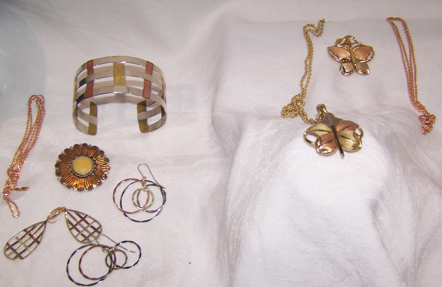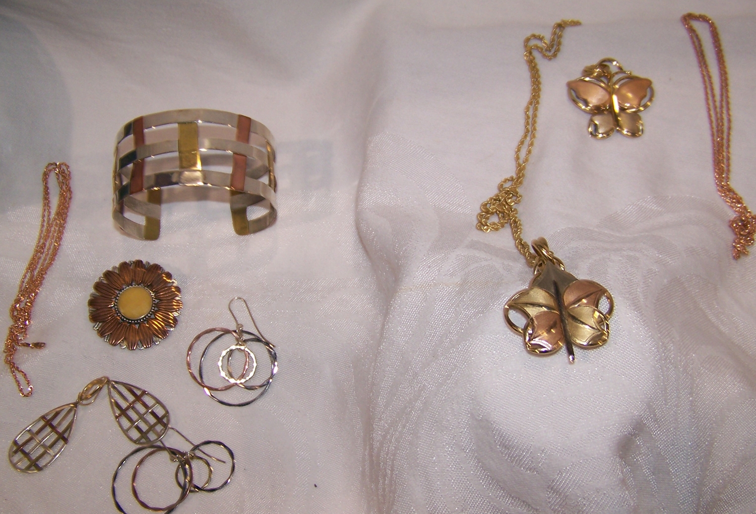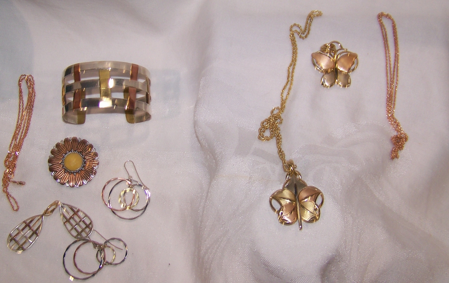 Assorted sterling Silver brass & copper jewelry includes a bracelet,(2) pairs of earrings, & one pin