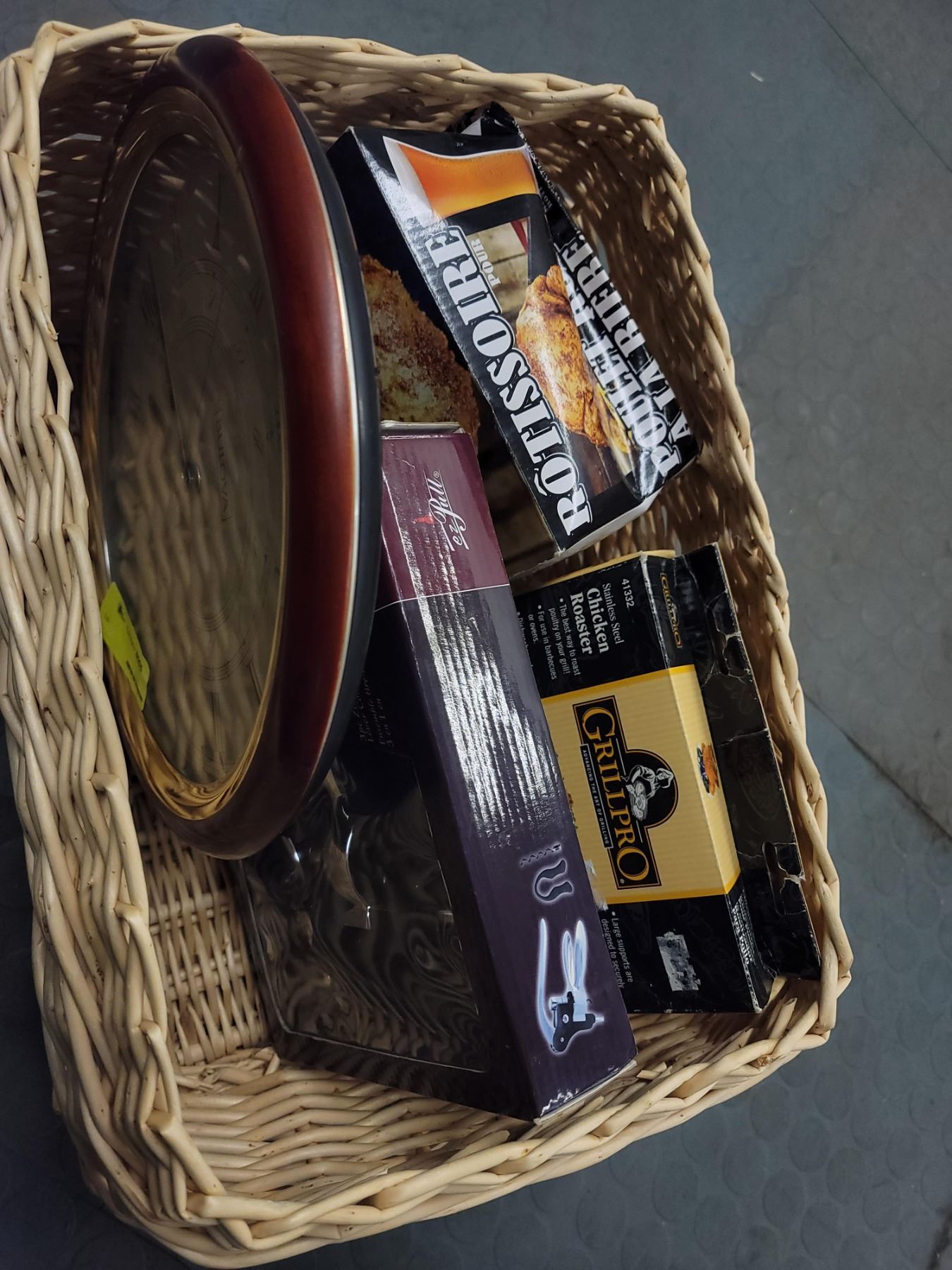 WICKER BASKET OF ASSORTED HOUSEHOLD DECOR