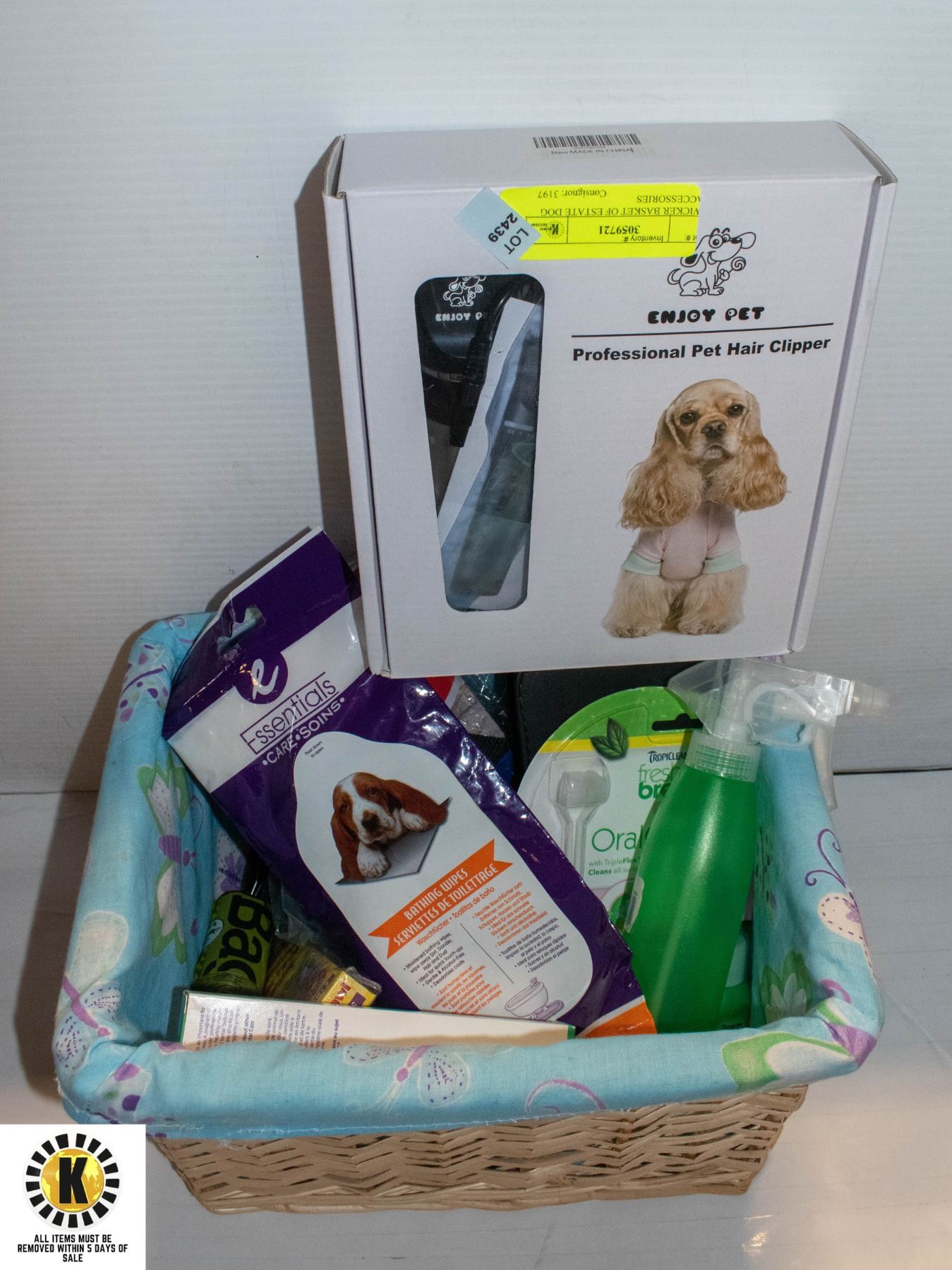 WICKER BASKET OF ESTATE DOG ACCESSORIES