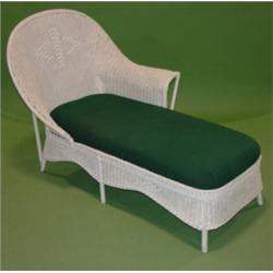 WHITE WICKER CHAISE LOUNGE WITH GREEN SEAT. Good overall cond. 37.5"H, 21.5"W, 50"L.