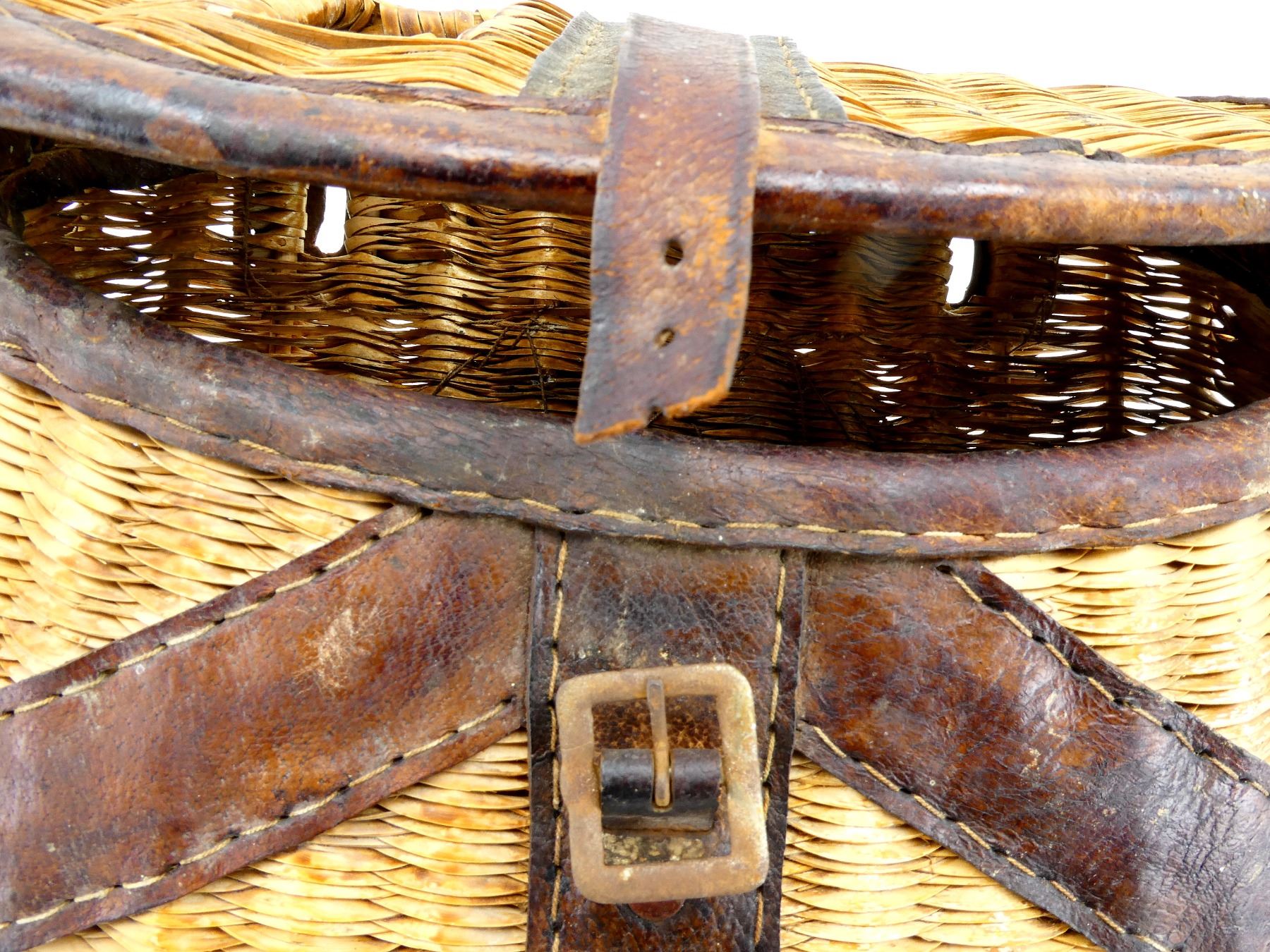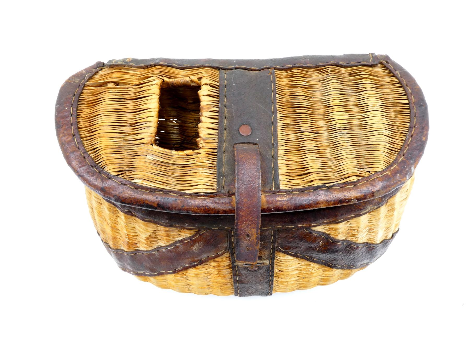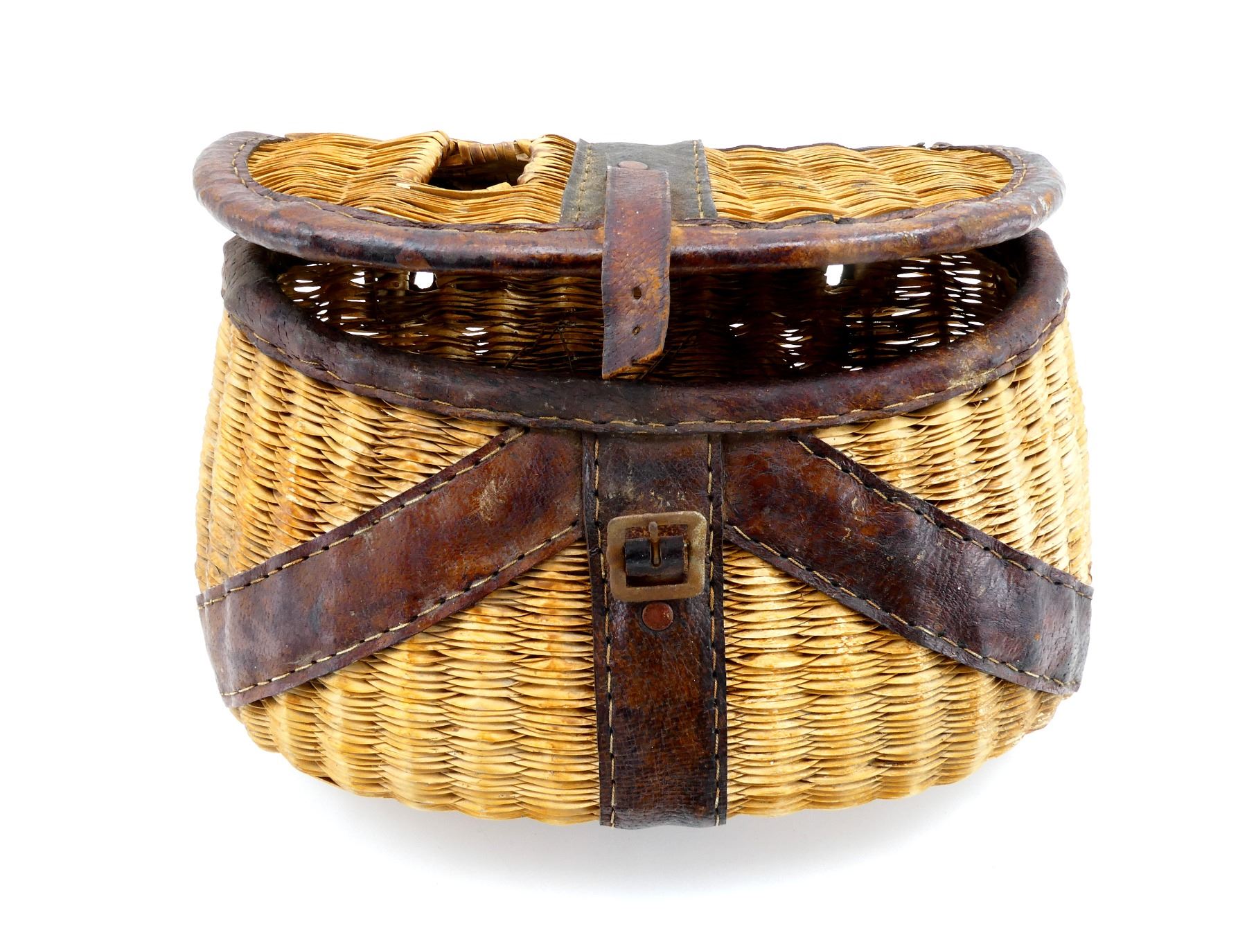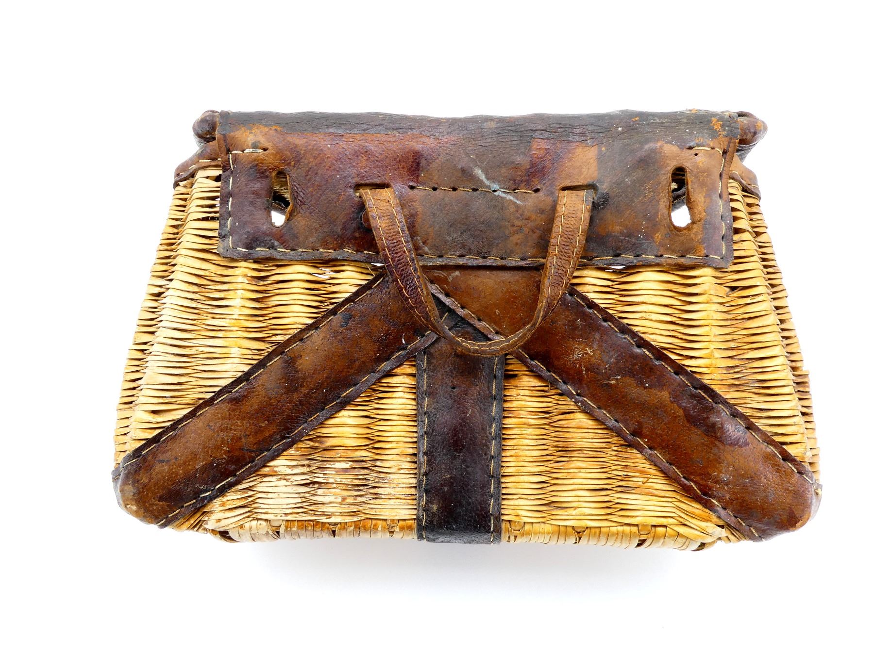 (1) WICKER AND BROWN LEATHER FISHING CREEL WITH METAL FITTINGS & HANGING LOOP APPROX. 13" X 4.5" X 7.5". SEE PHOTOS.