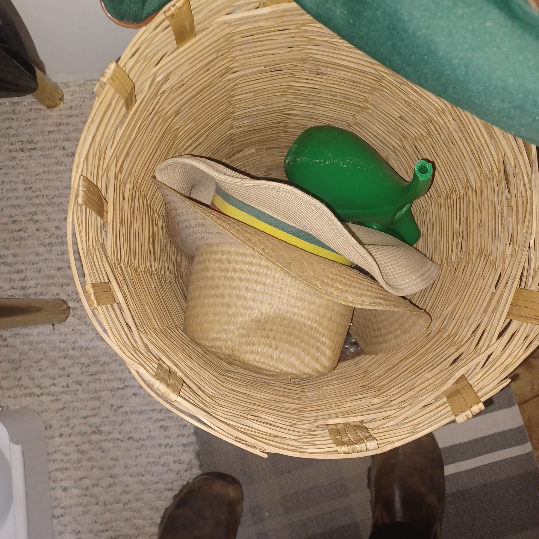 WICKER LAUNDRY HAMPER C/W SUITECASE AND LARGE STETSON HATS