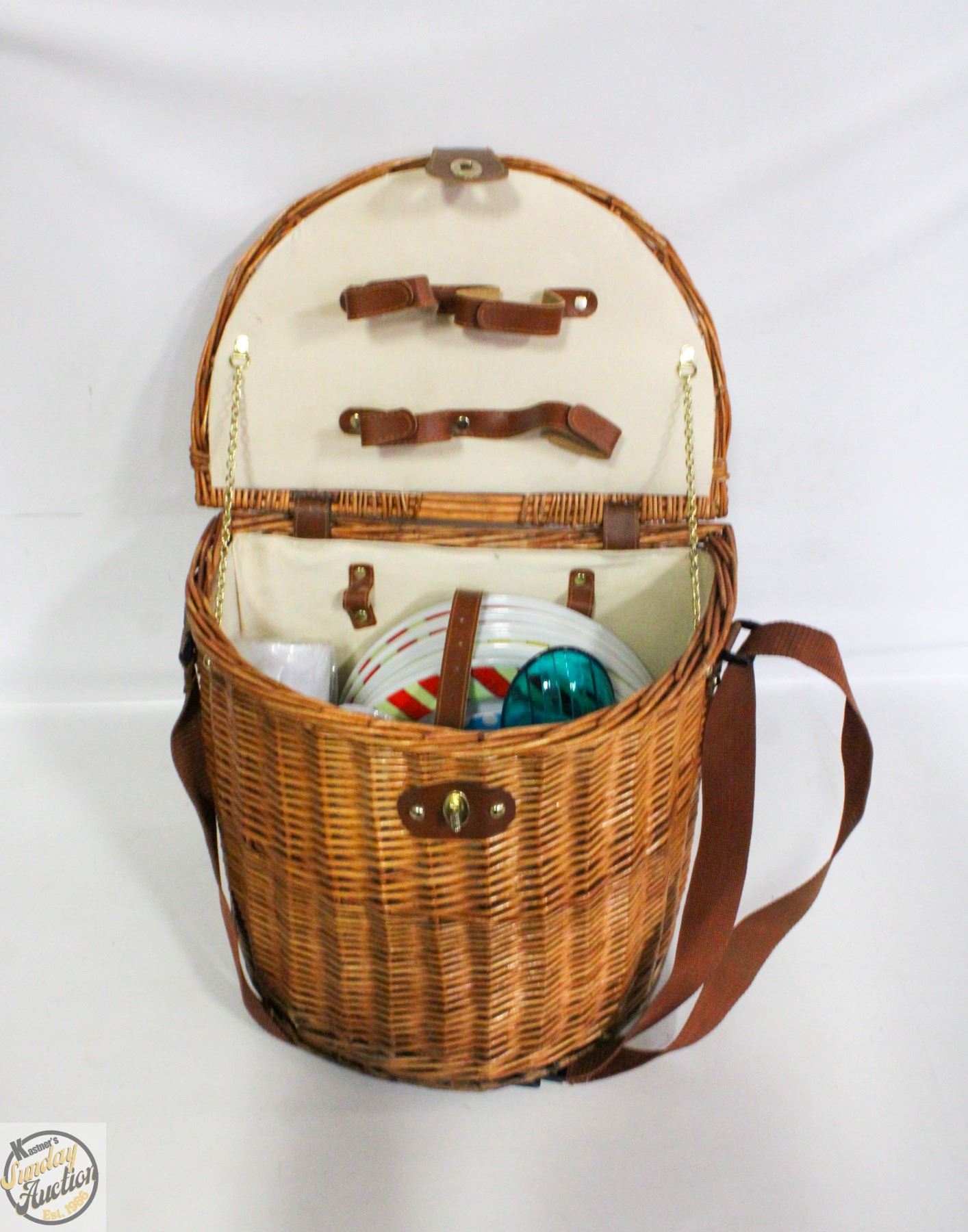 WICKER PICNIC BASKET WITH ITEMS IN IT