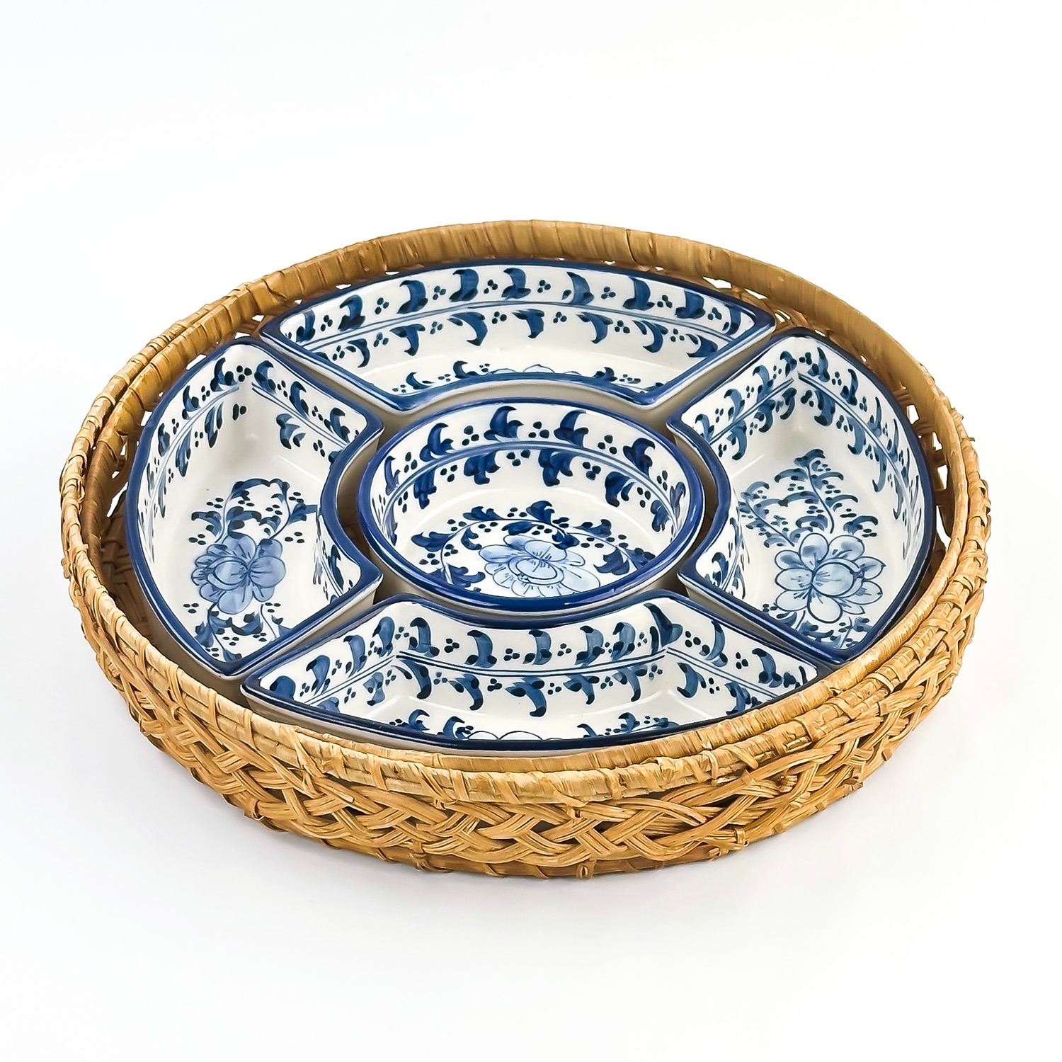 #8122 - WICKER TRAY OR BASKET WITH PORCELAIN CONDIMENT OR SNACK SET. BLUE & WHITE FLORAL FLOWER LOTUS DESIGN. BASKET MEASURES: 12.25” (31 CM) DIAMETER AND SITS 2” (5 CM) HIGH