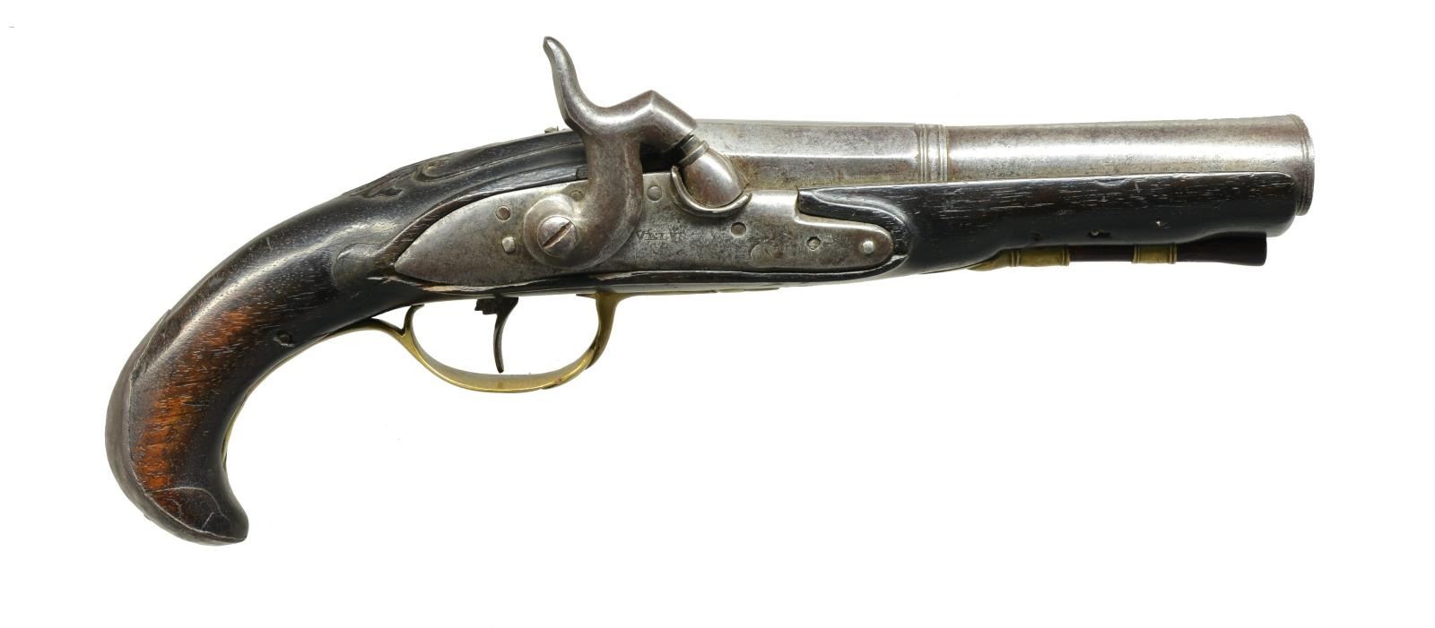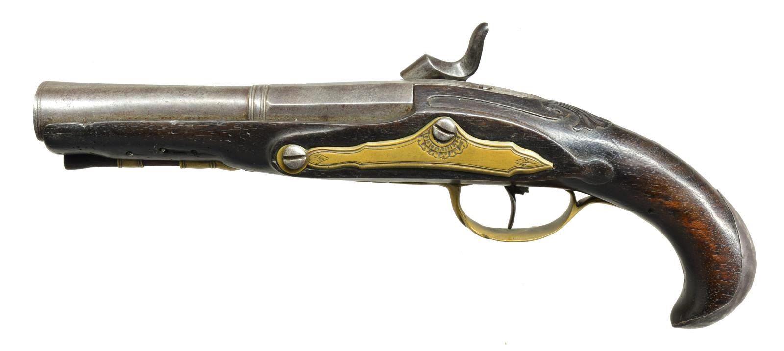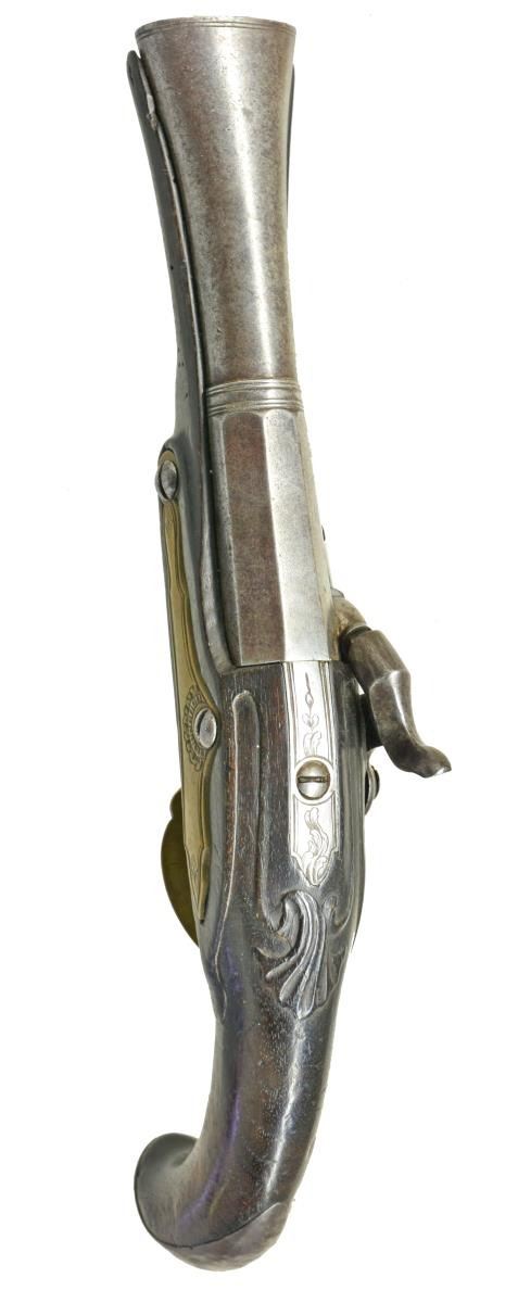 VELUS" CONVERTED TO PERCUSSION. NSN. Bbl. 6" w/ oct. rear section has oval muzzle w/ bore .85" high & 1.55" wide. Bbl. has been converted to percussion w/ shaped drum & nipple. Early style slightly arched & rnd. bodied lock is converted to percussion w/ rnd. bodied hammer & engraved "M. VELUS". Ebonized walnut stock is mostly brass mounted, except for steel plate on bird's head grip. Trigger guard has acorn finial. Sideplate is slightly raised & line border engraved. CONDITION: fair to good, iron parts cleaned to gray brown patina. Iron grip cap shows considerable rusting & cleaning. Brass nicely toned. Mechanically good. PROVENANCE: The Estate Collection of Gary Parietti. (01-19248/MGM). ANTIQUE. $800-1,200.