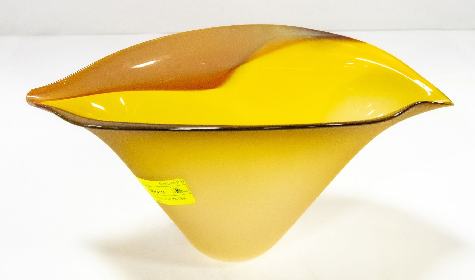 WIDE MOUTH GOLD AND BROWN ART GLASS VASE