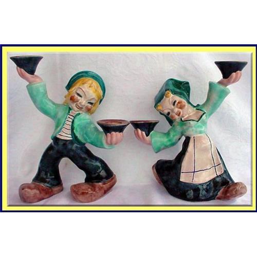 Signed Walter Bosse Wiener Werkstatte / Werkstadt pair of Art Deco figural candlesticks. Boy and Girl figurine, each holding a pair of candleholders in their hands. Made Vienna, Austria early 20th century (1920-30's).
