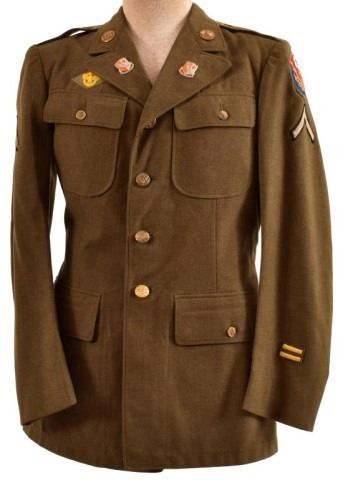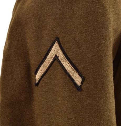 U.S. Army tunic & shirt for a private, ETO, one year overseas combat bars on left sleeve, Honorable Service Award Patch for an honorable discharge. Signal Corps collar brass & 69th Signal Battalion motto" Voix De Commande".