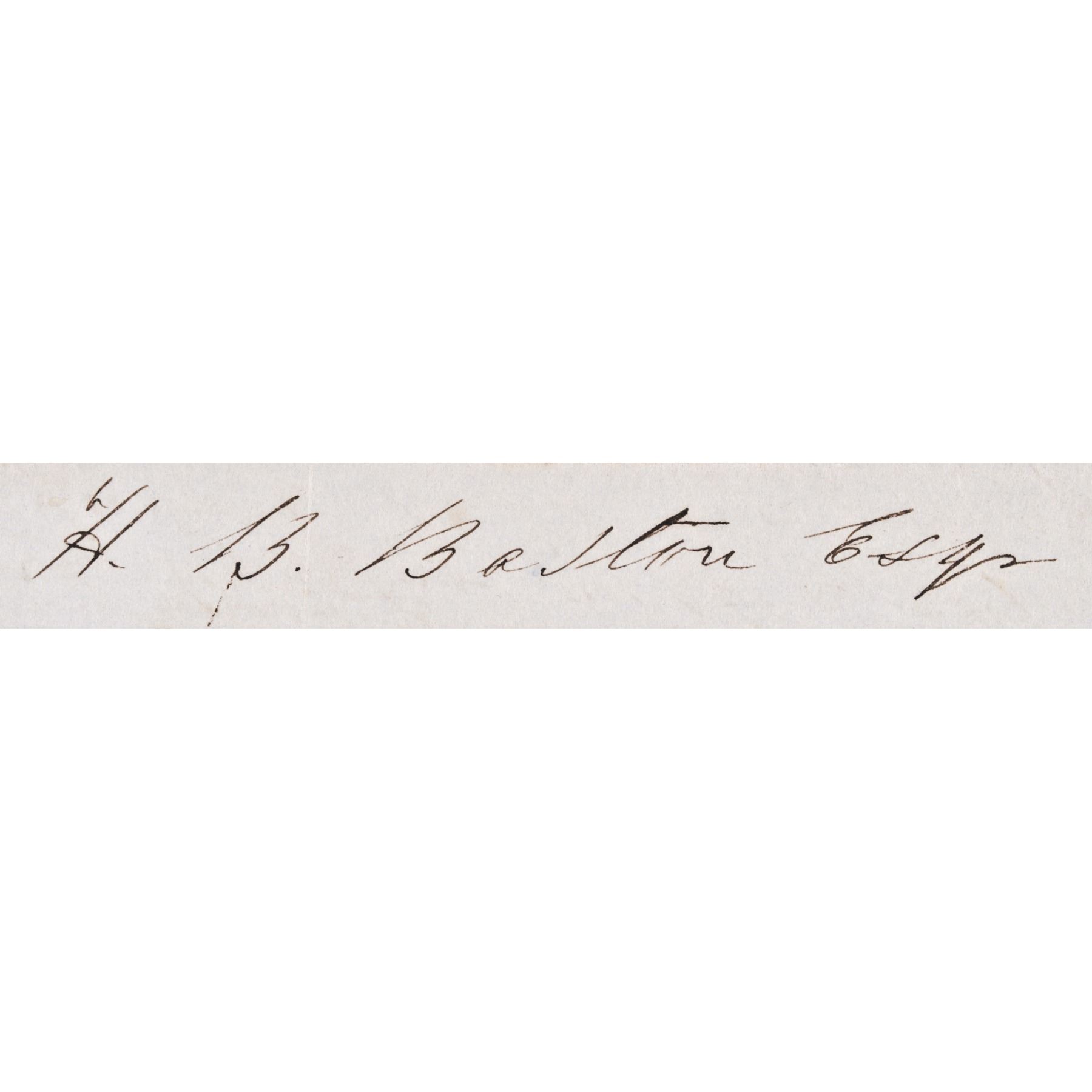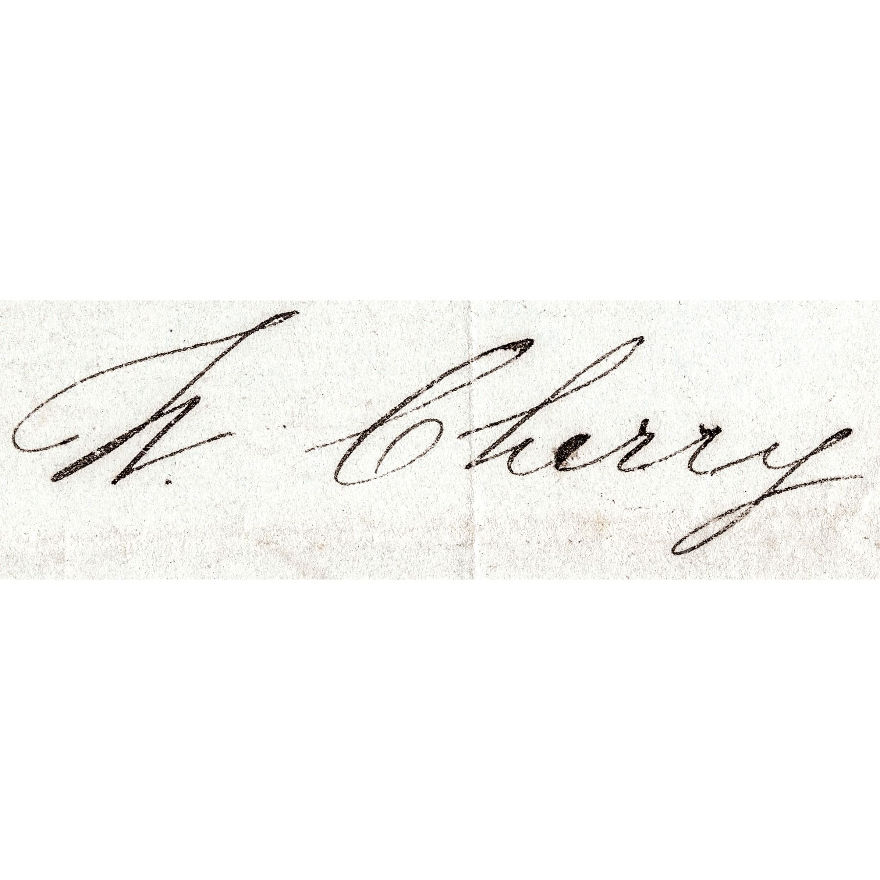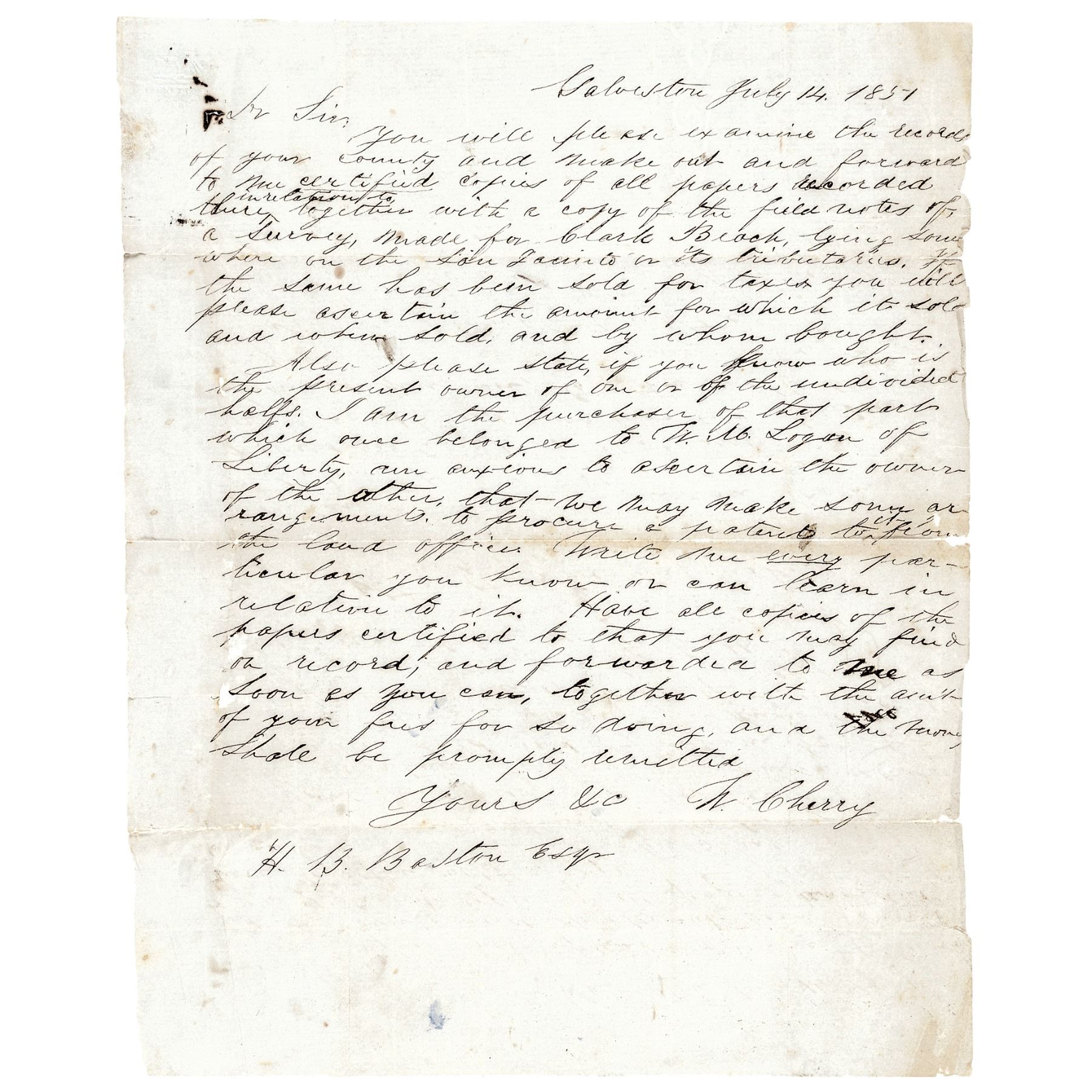 July 14, 1851-Dated, Rare Early Texas Related Autograph Letter Signed, “W. Cherry,” at Galveston, Texas, Very Fine. This original Handwritten Letter measures 11” x 9”, written to H. B. Balton, concerning a “Survey made for Clark Beach, lying somewhere on the San Jacinto in its Tributaries”. Wilber Cherry (Active Texas Pioneer) was with Ben Milan in the siege of Bexar (present day San Antonio) in 1835, with Brisoe’s, “Liberty Men.” Cherry is also credited with beginning the “Galveston Weekly News” in 1843 running it until his death in 1873.