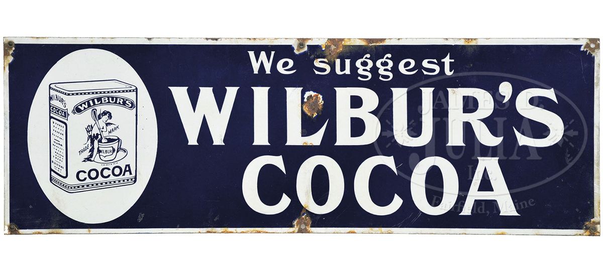 Uncommon sign features illustration of one of their packaged cocoas with a winged cherub. Made for Wilbur-Suchard Co. of Philadelphia. SIZE: 30" w x 10" t. CONDITION: Good to very good; chips to field and at mounting grommets. 1-13242