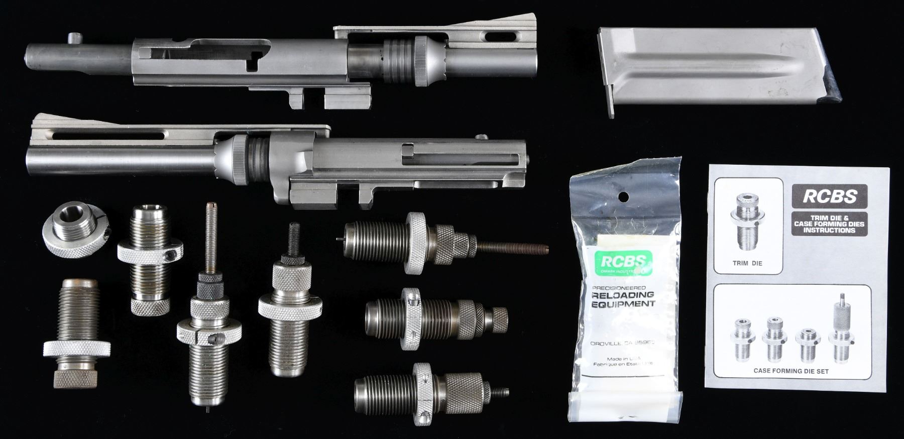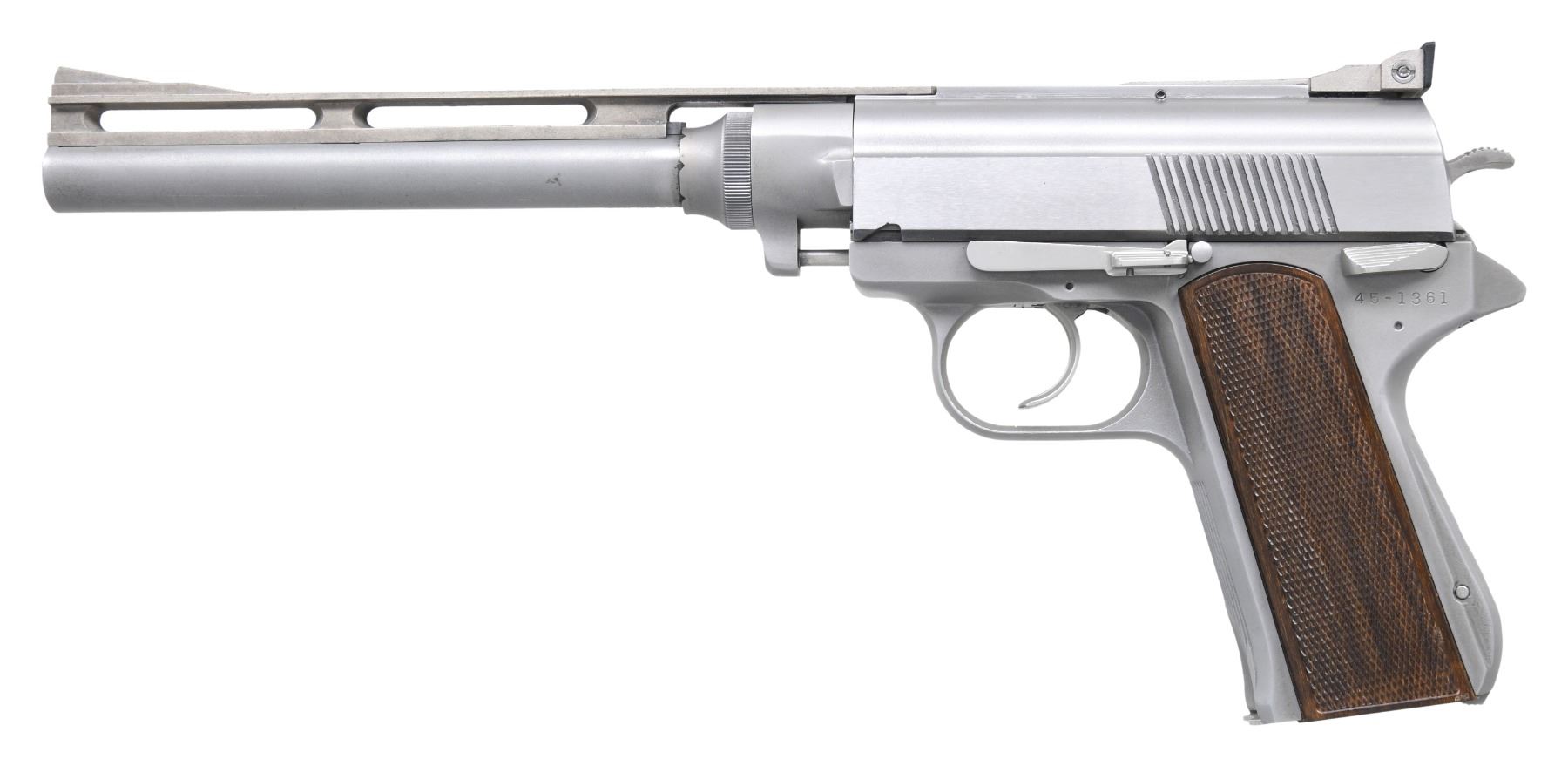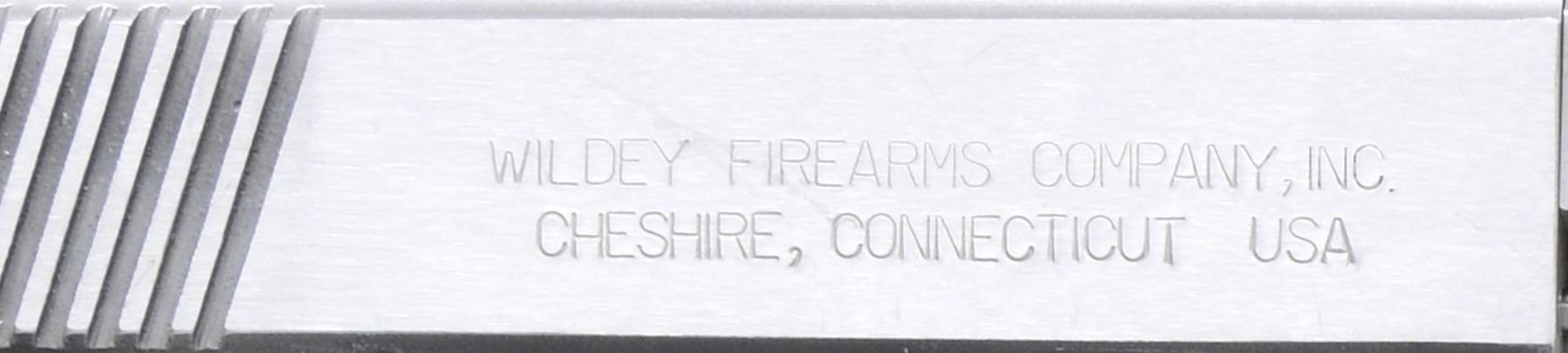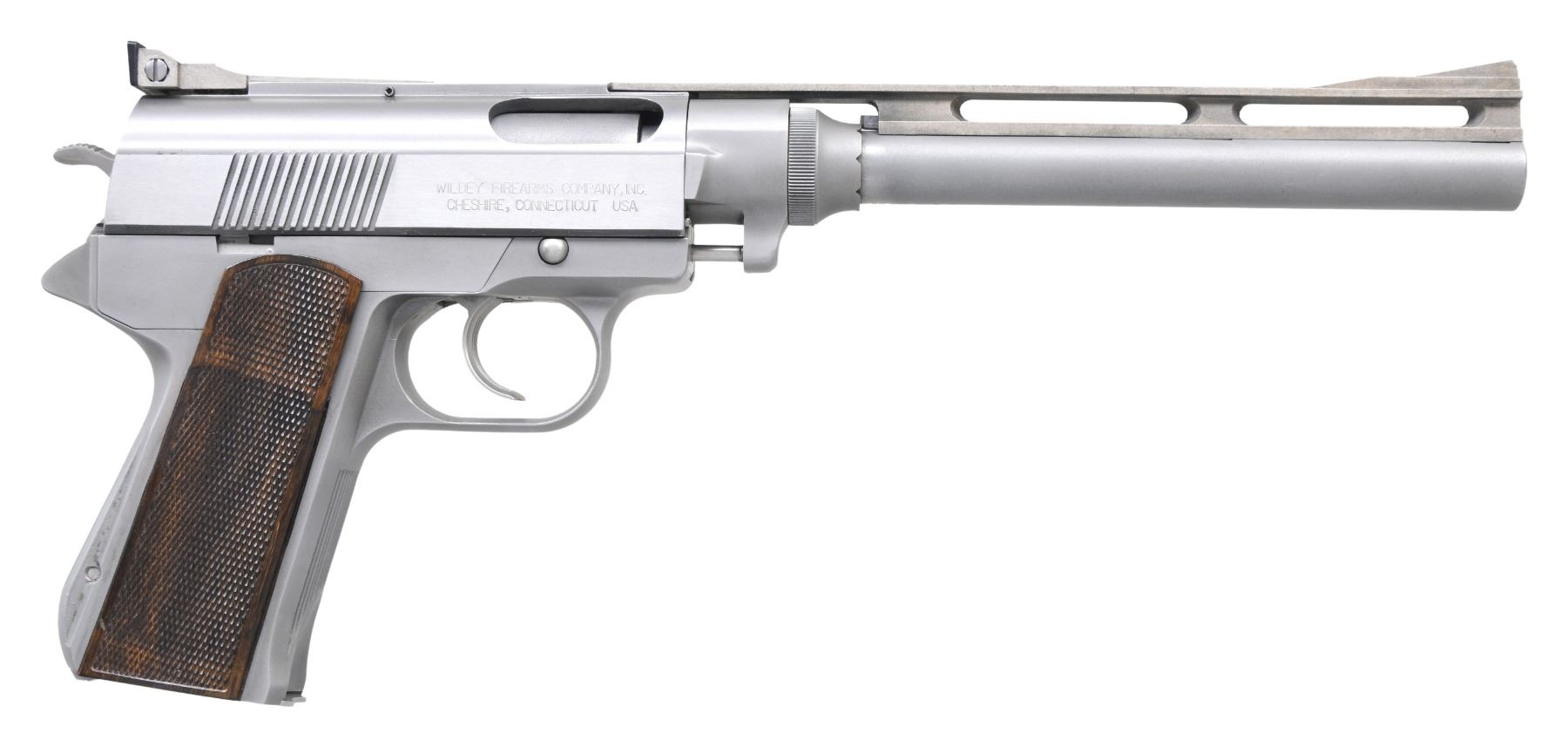 & EXTRAS. Cal. 45 Win. Mag. S# 45-1361. Bbl. 10" VR with integral ramped blade front sight plus slide mounted adjustable rear with matte black sight blade. Shipped with 6" barrel listed later. Double action with 1911 type controls; safety off in up position. Collar at rear of barrel is for regulating gas functioning. Serrated controls along with trigger and grip straps. Mag. latch is European style at base of back strap. Mfg. in Cheshire, CT within the earliest examples as indicated by the 45 serial number prefix. Invented by Wildey J. Moore; patented Nov. 2, 1976. Very large pistol in bushed and matte stainless steel that was the first gas operated semi-auto pistol. Original company sold after about 800 units with 45 prefix yet another reference ends the 45 prefix at 2489. Next series had 09 prefix; 633 pistols made. Last examples before those today by USA Firearms Corp. have 4 digits only and New Milford, CT address rather than Cheshire, CT. In 1985 the movie "Death Wish 3" had star Charles Bronson portraying Paul Kersey using a 475 Wildey that was actually Bronson's own personal pistol. Besides being the first gas powered pistol of high power, it was also adjustable for mild load functioning as well. As time progressed, other chamberings were offered with the first 3 being 45 and 475 Wildey Mag. plus 45 Win. Mag. Finely checkered hard wood grips with hidden retaining latches. An iconic pistol of top quality that is seldom offered for sale with extra barrels and original packaging. MAGS: 2 factory 7 rd. stainless. UNATTACHED ACCESSORIES: fair to good original cardboard box with end label matching pistol. Near excellent 8" barrel assembly in 9mm/45 Win. Mag. Near excellent 6" (original) barrel assembly in 45 Win Mag. (missing piston; take from other barrel). Two very good RCBS 4 die sets for reloading each caliber plus forming set for 9mm variation. Near excellent 1982 Instruction Manual & Parts Catalog plus very fragile single page insert explaining break in period, etc. CONDITION: all aspects near excellent including bore and grips. (25-1565/NW). MODERN. $2,500-3,500.