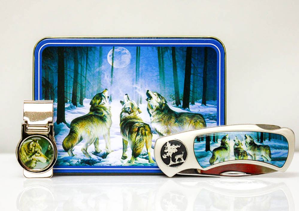 WILDLIFE STAINLESS STEEL HOWLING WOLF KNIFE W/ MONEY CL **|**|** WILDLIFE STAINLESS STEEL HOWLING WOLF KNIFE W/ MONEY CLIP
