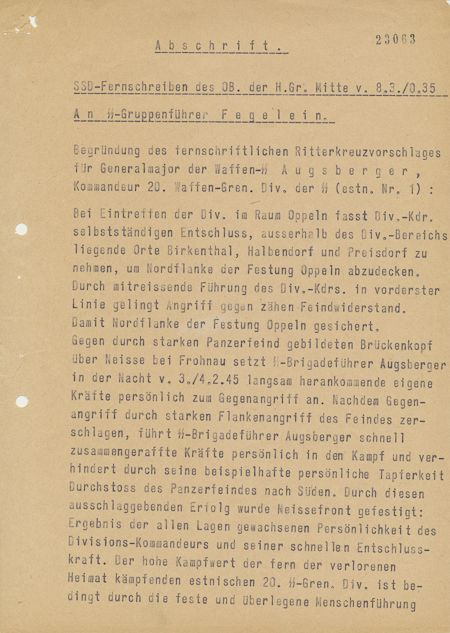 (1895 - 1945) German general and Hitler's Chief Adjutant, escorted Rommel when the latter was forced to commit suicide, and sat on the tribunal that condemned Hermann Fegelein to death. Fine content and association war-date A.N.S. in pencil written at the conclusion of his copy of an SS Security Teletype sent to the man he would condemn to death a few months later, SS Lt. Gen. Hermann Fegelein. The undated message, 2pp. 4to., was sent by Gen. FERDINAND SCHORNER to headquarters in Berlin. Schorner recommends that Major Gen. FRANZ AUGSBERGER, commander of the 20th SS Frontier Division, be awarded the Knight's Cross: "...he succeeded in attacking against tenacious opposition...the north flank of the fortress at Oppeln was secured. Against heavy tank resistance on a bridgehead built over the Neisse...Augsberger established himself...being beaten unmercifully by heavy attacks to his flank by the foe...Neissefront became secure...He is the epitome of high excellence...". At bottom, Burgdorf notes in dark pencil: "Knight's Cross on March 8, 1945 given by Fuhrer. Burgdorf". File holes in left margin, else very good. Schorner personally presented Augsberger with his Knight's Cross on March 8th...on March 10th Augsberger was killed in action near Neustadt during an attempt to break out of Oppeln which had by that time been completely encircled by Soviet forces. Of all the parties named in this document, only Schorner would survive the war - Burgdorf would commit suicide in the Fuhrerbunker following Hitler's lead.Fegelein would be executed following his escape from the Fuhrerbunker in the final days.