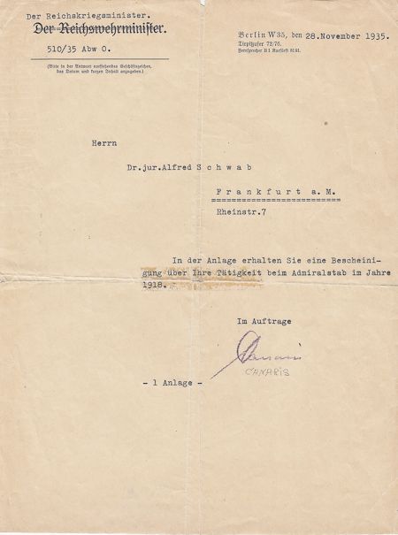 (1887-1945) German admiral and head of the German intelligence agency Abwehr. T.L.S. "Canaris" in indelible pencil on Reichskriegsminister Abwehr letterhead, 1p. 4to., Berlin, Nov. 28, 1935 to attorney Dr. Alfred Schwab advising that attached (not present) is a certification of Schwab's employment in the Admiralty in 1918. Tape stain affects text at center, else very good.