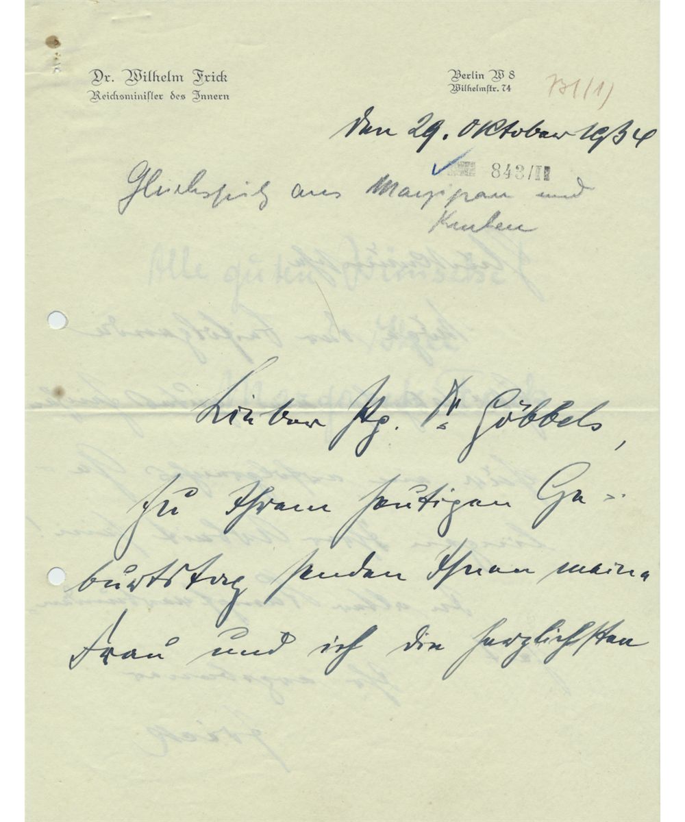 (1877 - 1946) Nazi Minister of the Interior, author of the Nuremburg Laws. Hanged at Nuremberg for his crimes. Fine association A.L.S. "Wilhelm Frick" with attached A.N.S. of his wife, MARGARETE FRICK on his official letterhead, 3pp. . 4to., Berlin, Oct. 29, 19[34] to Minister of Propaganda JOSEPH GOEBBELS. In part: "...For your birthday today best wishes from me and my wife. I hope that the enclosed glueckspilz is a good sign for your succesful work...". His wife adds her birthday wishes on the attached page. File holes else very good. "Glueckspilz" is literally "a lucky mushroom". In this case, it was marzipan, an almond-flavored treat which not a single American has ever developed a taste for.