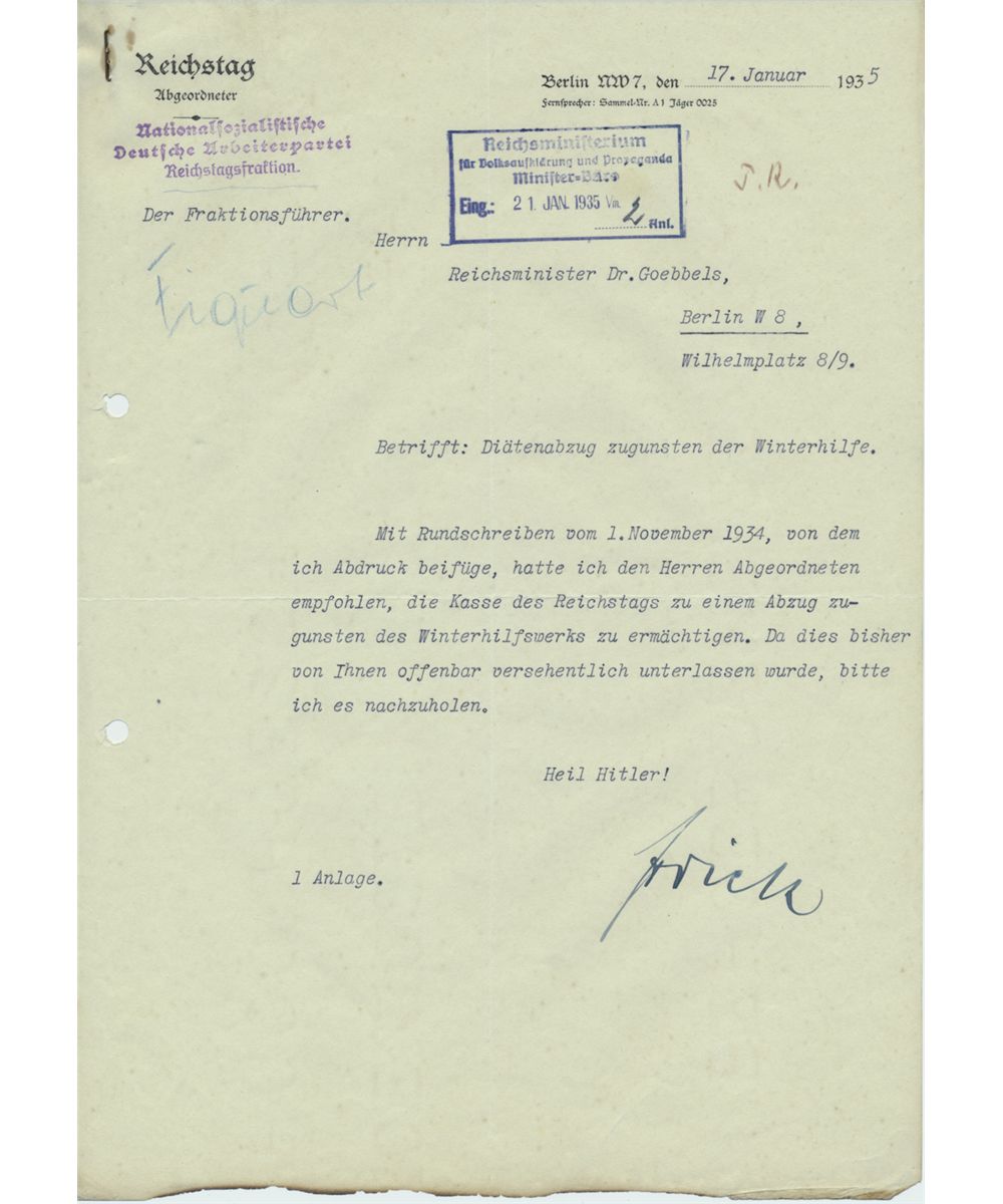 (1877 - 1946) Nazi Minister of the Interior, author of the Nuremburg Laws. Hanged at Nuremberg for his crimes. Fine association T.L.S. on Reichstag letterhead, 1p. 4to., Berlin, Jan. 17, 1935 to Minister of Propaganda JOSEPH GOEBBELS. Frick discusses withholding of a portion of government wages to be contributed to the W.H.W. state charitable organization. File holes at left, staple at top, ink stamp and singed at bottom from attempted burning - still very good.