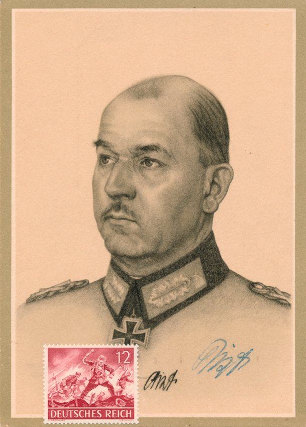 (1880 - 1971) German field marshal and ardent Hitler supporter, led the 14th Army in Poland, the 12th Army in the Balkans, and as field marshal commanded Army Group A on the Russian front. Scarce S.P. 4" x 6" b/w, a reproduction of an artist's portrait of List signed post-war in blue ink at bottom. A war-time stamp is affixed at bottom as well. Very good.