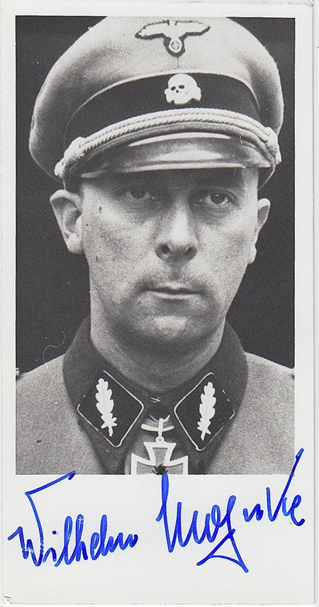 (1911 - 2001) High-ranking and long serving SS officer who was involved in the Malmedy massacre during the Battle of the Bulge in 1944. S.P. 2" x 4" b/w bust photograph boldly signed in blue ink in the bottom blank margin. Very fine.