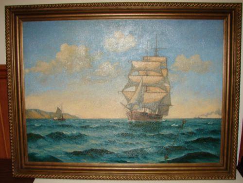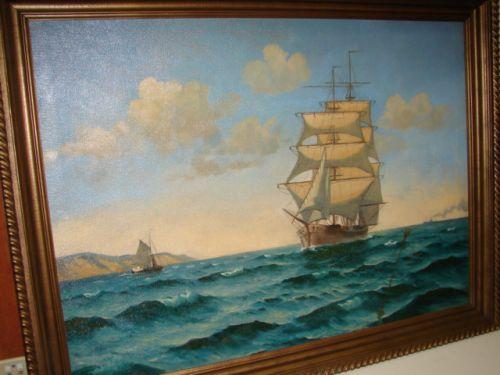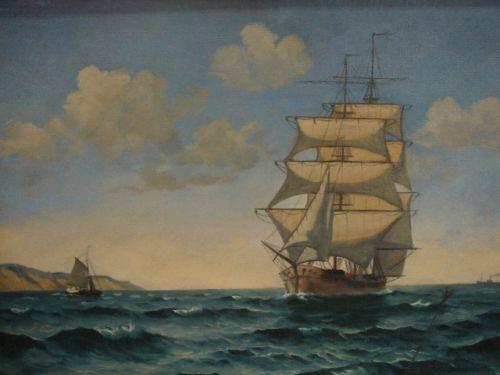 CARL BILLE WILHELM (DANISH, 1889-1944) OIL ON LINEN PAINTING. Two Sailing Vessels Near Shore, a Steamship on the Horizon. Circa 1935. 27.75” x 38”. 32.75” x 43” framed.