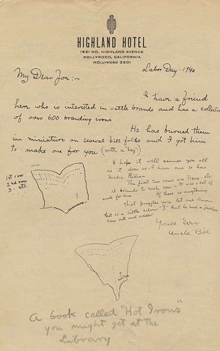 (1869 - 1944) American ink artist for newspapers and magazines, he also illustrated a number of books, often with a historical or Western themes. Crawford was a close friend of fellow western artists Charles M. Russell. Lot of four A.L.S.s signed variously "Will" and "Uncle Bill", one letter illustrated, 10pp. total, 8vo., Los Angeles and Hollywood, 1938-40, to his sister and her young children. In part: "...I have a friend here whi is interested in cattle brands and has a collection of over 600 branding irons...he has burned them in miniature on several bill folds and I got him to make one for you...The first two rows are Texas...12 brands to each row. It was a lot of work for him [Crawford adds two sketches of the wallet]...Lots of trout, coons, white tail deer and mountain lions. There is a bounty on the lions but it pays most to catch them alive...and selling them to circuses and menageries in the east...I can't send the rattlesnake skin yet because I am waiting to send something else in the bundle...I would rather see you than anything in the world...Tell him not to grow up so fast he forgets Uncle Bill...I am on my own with the museum work...went to a 'graduation' finish of a study in Marxism...She and Charlie deep in the movement...". Fine.
