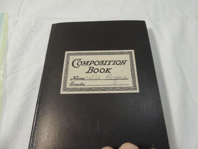 COMPOSITION BOOK SIGNED WILL ROGERS ON THE COVER. FILLED WITH ARTICLES ABOUT WILL ROGERS LIFE AND TIMES, EVENTS, ETC. AS SHOWN.