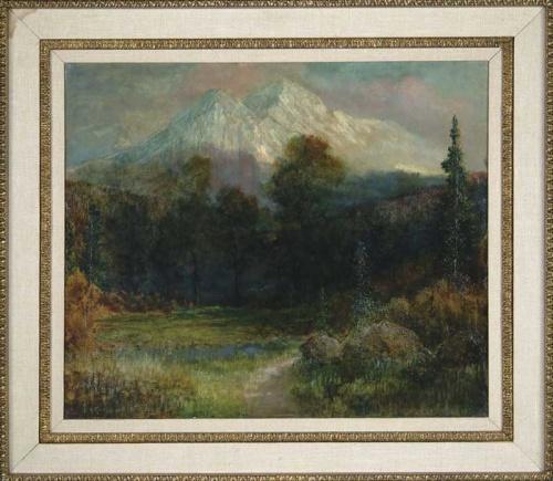 WILLIAM A. KNAPP (-1934) WESTERN MOUNTAIN SCENE. Oil on board scene shows a twin peak snow covered mountain in background with a stream, meadow and hillside trees. Signed lower left "W. A. Knapp". Housed in a linen and gilt wood frame. SIZE: 23" x 27". CONDITION: Very good. 9-27631