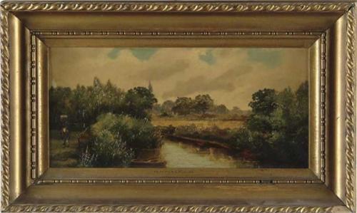 WILLIAM AIKEN WALKER (American, 1838-1921) BACK FROM THE COTTON FIELDS. Oil on board scene shows a black man with basket of cotton on head walking towards small boat next to large grasses and water. A fence is seen along the edge and in background. Signed lower right "W A Walker". Housed in its original gold gesso decorated frame with painted artist name and date "1892". SIZE: 9-1/4" x 18-3/4". CONDITION: Dirty, one small spot on left side just above trees. Otherwise very good. 9-27919