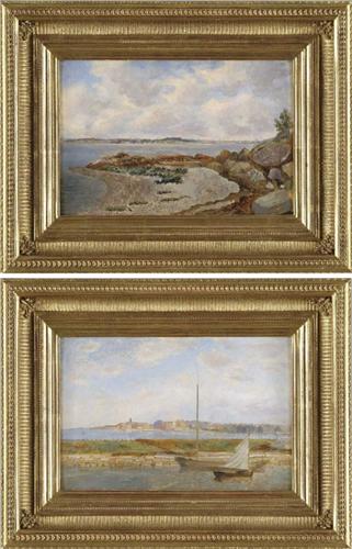 WILLIAM B. GLEASON (American, 1824-1886) "THINGLE BEACH" AND "FROM LITHFIELD'S". Pair of oil on board Boston Harbor scenes. Both have title on reverse and one is dated "June 22, 1878". Unsigned fronts and one is signed on reverse. Both housed in identical antique style gesso decorated gilt frames by Guido Frame Studio. SIZE: 8-1/2" x 12-1/4". CONDITION: Slight warp to boards, inpainting. Very good. 9-27289