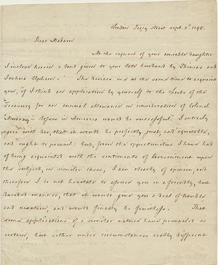 (1737-1802) American politician, the grandson of William Burnet who for many years served as a representative of Salem, Mass. Banished for Loyalist leanings in in 1776 and remanded to London, he was named Governor of Bermuda in 1781. Uncommon A.L.S. 2pp. 4to., London, Sept. 2, 1795, to Mrs. Murray, in part: "...At the request of your amiable daughter I inclose herein a bond given to your late husband by Phineas and Joshua Upham...She advised me at the same time to acquaint you 'if I think an application by yourself to the Lords of the Treasury for an annual allowance in consideration of Colonel Murray's [?] in America would be successful.' I entirely agree with her, that it would be perfectly just...and ought to prevail; but, from the opportunities I have had of being acquainted with the sentiments of Government upon the subject, in similar cases, I am clearly of opinion, and therefore I do not hesitate to assure you in a friendly, but decided, manner, that it would give you a deal of trouble and vexation, and would finally be fruitless...". Loss on integral address leaf from opening, otherwise very good.