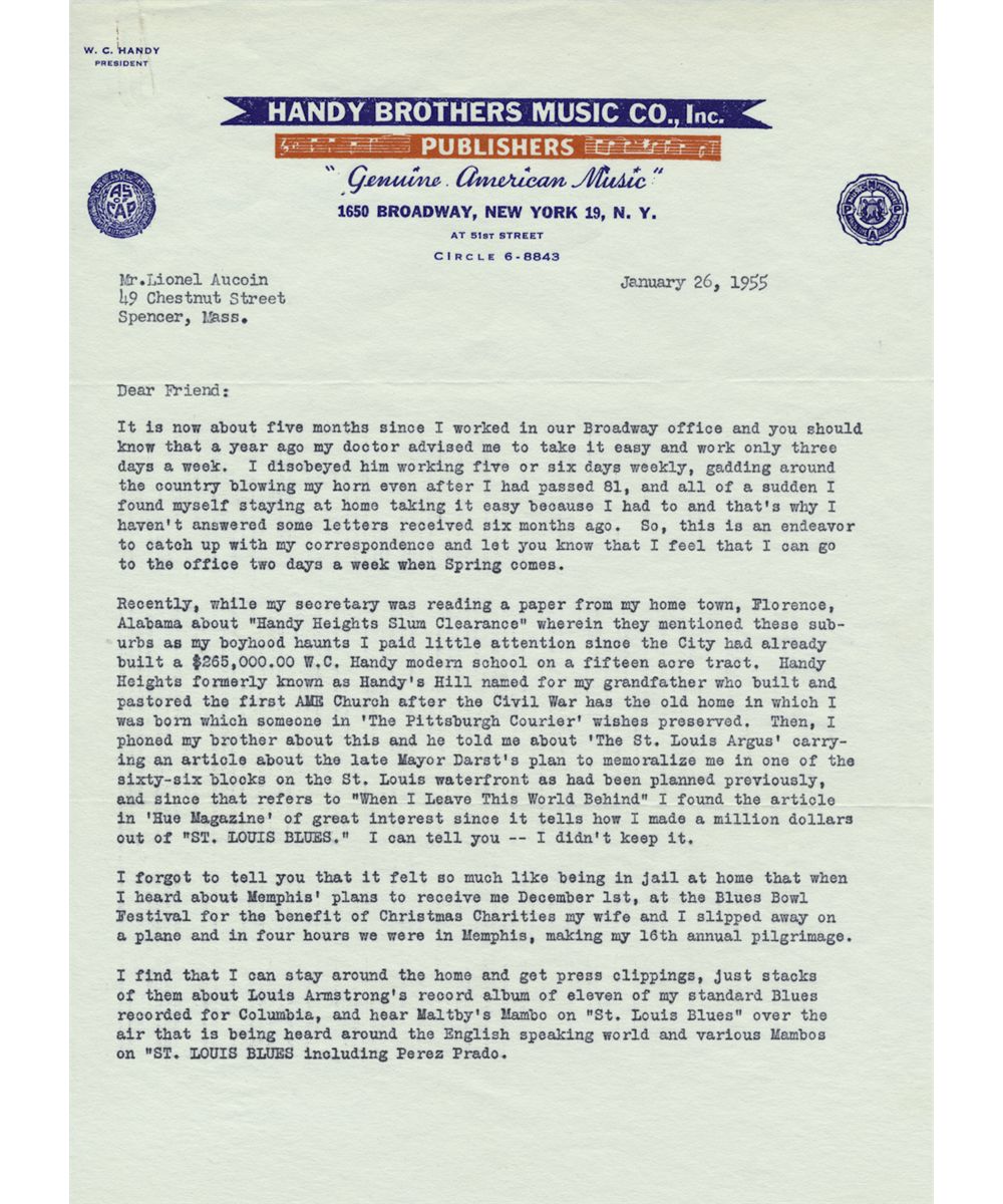 (1873-1958) American musician and composer considered "Father of the Blues", composer of "Memphis Blues" and "St. Louis Blues". Fine content T.L.S. on Handy Brothers Music Co. letterhead, 2pp. 4to., New York, Jan. 26, 1955 to a friend. In part: "...my doctor advised me to take it easy...I disobeyed him working five or six days weekly...". He describes a clipping from a Florence, SC paper clearing slums on "Handy's Hill" and naming a block after him, also a mention of his having made a million dollars on his song St. Louis Blues. He mentions his exhaustion and despair at being confined to his home, but does get pleasure from press clippings he receives: "...about Louis Armstrong's record album of eleven of my standard Blues recorded for Columbia, and hear Maltby's Mambo on 'St. Louis Blues' over the air...". Fine.