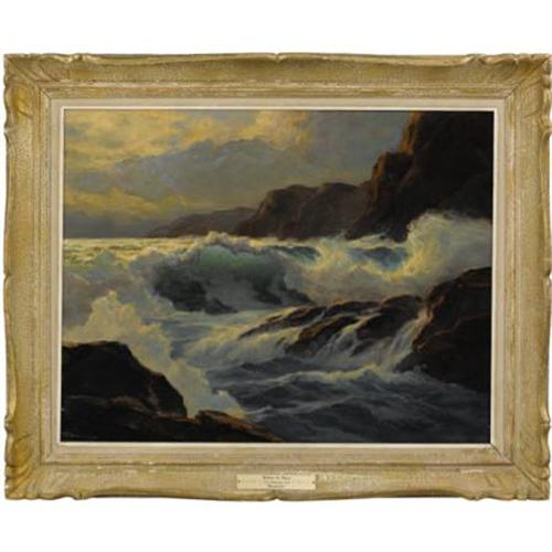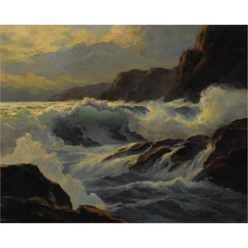 <B>WILLIAM COLUMBUS EHRIG </B></I>(American 1892-1942)<BR><I>Spindrift</B></I>, circa 1930<BR>Oil on original unlined canvas<BR>22 x 28 inches (55.9 x 71.1 cm)<BR>Signed lower left: <I>Wm. C. Ehrig</B></I><BR>Label verso: <I>Salmagundi Club, Auction exhibition Wm. C. Ehrig Title: Spindrift</B></I><BR> <B>Condition Report:</B> Original frame. Yellowed varnish; minor frame abrasion; 1/8 x 1/4 inch long paint loss to lower edge; 1/4 x 1/8 inch of inpainting to upper right corner of painting.<BR><BR><b>Shipping:</b> Requires 3rd Party Shipping (<a target="_blank" href="http://www.heritageauctions.com/common/shipping.php">view shipping information</a>