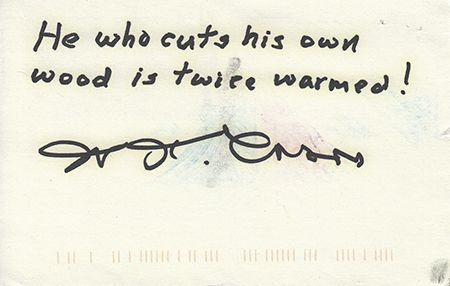 (b. 1916) Grandson of Adolph Coors, the founder of the Coors Brewing Company. William Coors has been affiliated with the company for 64 years, and was a board member from 1973 to 2003. A.Q.S. on a white card: "He who cuts his own wood is twice warmed! W. K. Coors".