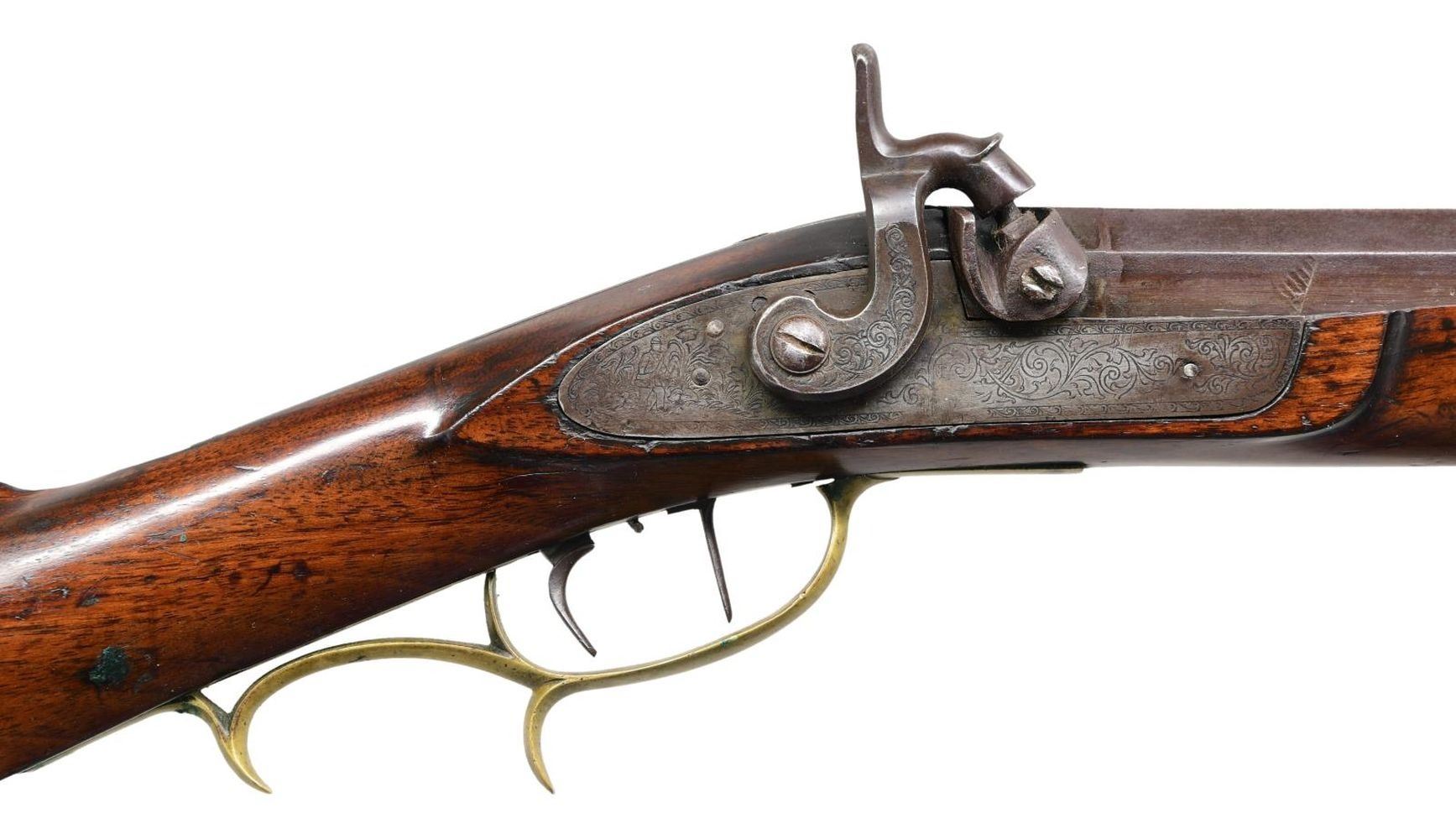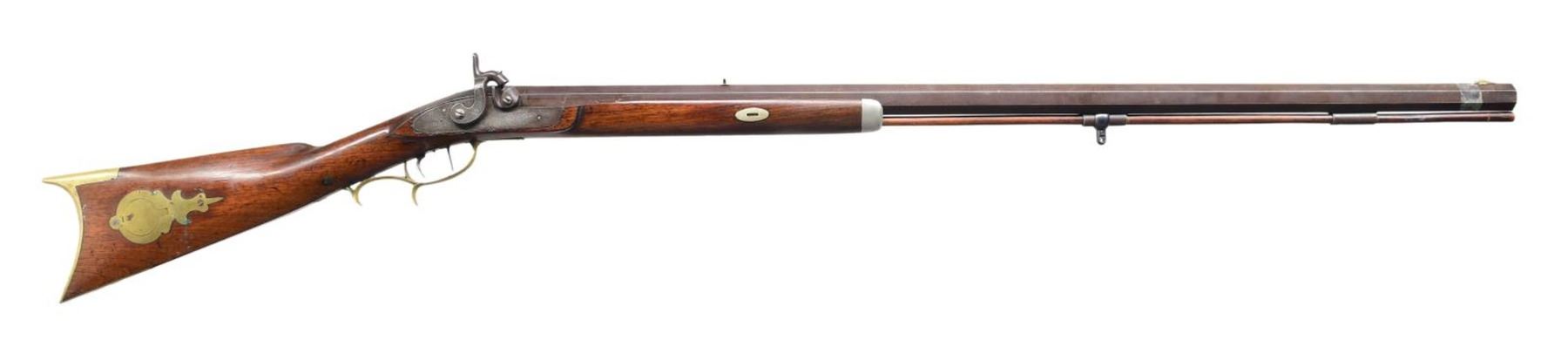 RIFLE. Cal. 48. NSN. Bbl. 35 1/8". Half stock percussion Kentucky rifle mfg. by William Craig of Allegheny, PA. The top flat of the heavy octagonal bbl. is marked "WM CRAIG", followed by "ALLEGHENY PA" towards the breech. Lockplate and hammer exhibit scroll engraving, with the lockplate additionally feature an engraved scene of a man walking through a field. 1-piece wood half stock features a brass buttplate, patchbox, and trigger guard, with a pewter nosecap. Ramrod ferrules are comprised of iron, with the rear ferrule having been mounted with a contemporary sling attachment. German silver blade front sight with U-notch rear sight. CONDITION: iron components retain a mottled dark gray patina, with light pitting present overall. Brass components exhibit a soft patina, with scattered spots of verdigris. Action functions only when the set trigger is activated. Stock exhibits scattered marks and minor impressions from handling and storage overall, with a sizeable loss to the wood present on the right side that stems from the lockplate. (01-25100/MLW). ANTIQUE. $1,500-2,500.