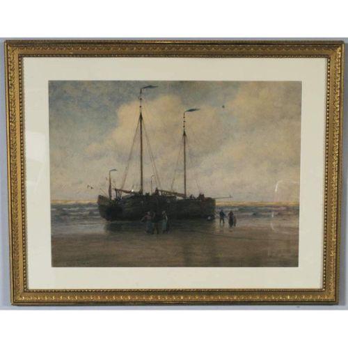 WILLIAM E. NORTON, 17"x23" watercolor, Dutch Boats Beached, with signed Geo. F. Of frame, CONDITION REPORT: toning, otherwise no damage or restoration.