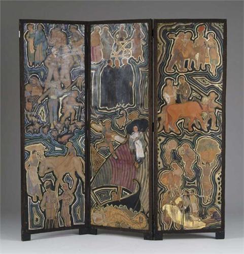 WILLIAM EDWARD B. STARKWEATHER (American, 1879-1969) THREE PART PAINTED AND DECOUPAGE ROOM SCREEN. Unsigned three panel screen has decoupage sketched and painted figures pasted with colorful green, blue, black and brown dividing shapes. The figures include men and women, boy on donkey, uniformed men, oxen, girl with basket on head and more. Black material border and black material back. SIZE: 61" h; each panel is 20". 60" total width. CONDITION: There are some scotch taped breaks and cracking. Fair to good. 9-27759