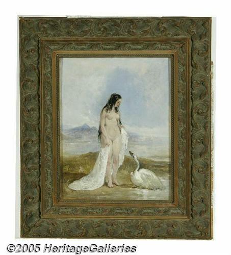 <B>WILLIAM EDWARD FROST (British 1810- 1877)</B></I><BR>Leda and the Swan<BR>Oil on panel<BR>15in. x 12in.<BR><BR>Condition Report: Small blister in top right corner with minor lifting but no paint loss, small loss area (2mm) lower left, surface dirt near head of Leda and along left side<BR>