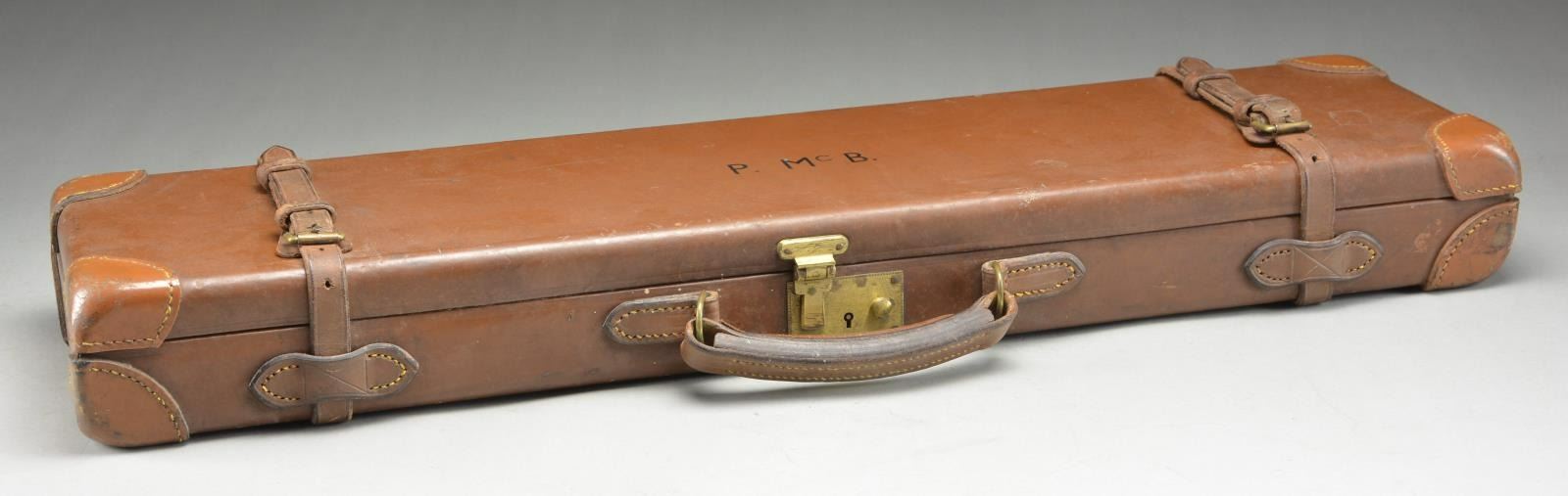 Overall: 29" x 8" x 3" brown leather hard case w/ brown leather trim. Lid is engraved "P. Mc B.". Burgundy felt English fit interior w/ partitions, mob, bore brush & 2 snap caps. Able to fit 26" barrels. CONDITION: case in fair overall condition w/ wear marks along edges & corners. Interior shows partition for shotgun butt under bbl. is broken off (pieces are contained in case) Interior parts have bleeding color from felt. (02-19742-4/MD). $200-300.