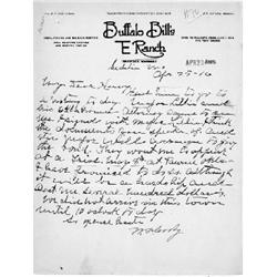 <b>143. WILLIAM F. CODY</b> (1846 - 1917) "Buffalo Bill", American scout and showman, he started his career as a rider with the Pony Express, and in later years organized and promoted "Buffalo Bill's Wild West Show". Good content A.L.S. "<i>W. F. Cody</i>" on his "<i>Buffalo Bill's TE Ranch</i>" letterhead, 1p. 4to., Sedalia, Mo., Apr. 25, 1916 to Henry, in part: "<i>...Had time to go to a notary today before Lillie and his Oklahoma attorney came to see us. I signed with [?] for [Gordon W. "Pawnee Bill"] Lillie. I think the documents you spoke of...They want me to appear at a trial May 8th at Pawnee Okla. I have promised to do so, although it will be a hardship and cost me several hundred dollars...</i>". Very good.<b>$700-900</b>