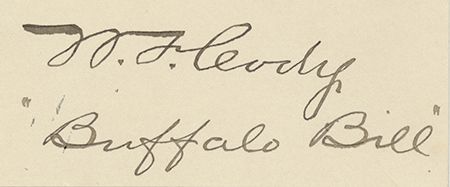 (1846 - 1917) "Buffalo Bill", American scout and showman, he started his career as a rider with the Pony Express and in later years organized and promoted "Buffalo Bill's Wild West Show". Fine bold signature executed on a small card: "W. F. Cody 'Buffalo Bill'". Mounting traces to verso, otherwise very good condition, ideal for display.