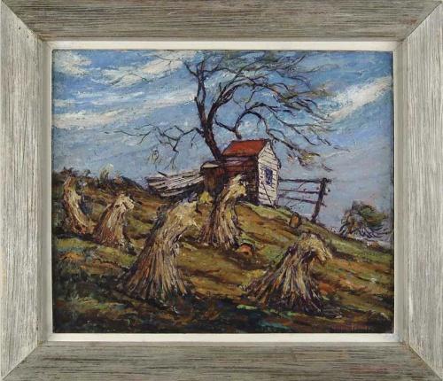 WILLIAM FISHER (American, 1891-1985) WINDSWEPT CORN STACKS. Oil on canvas scene shows slightly sloping hillside with harvested cornstalks A small building with red roof is on top of hill with wind swept tree. Signed lower right. Housed in a gray painted wood frame with white liner. SIZE: 25" x 30". CONDITION: Inpainting, good. 9-27304
