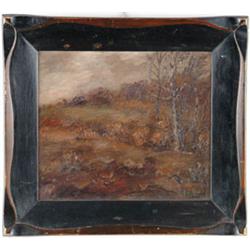 WILLIAM GEORGE REINDEL (American, 1871-1948) IMPRESSIONISTIC LANDSCAPE. Oil on canvas scene shows fields and woods under a dark gray sky. Some low bushes with bright foliage but generally a late fall/early winter scene. Signed lower right “WG Reindel 1910”. Housed in a carved painted wood frame. Partial label affixed to back. SIZE: 14” x 16”. CONDITION: Very good. 9-25157
