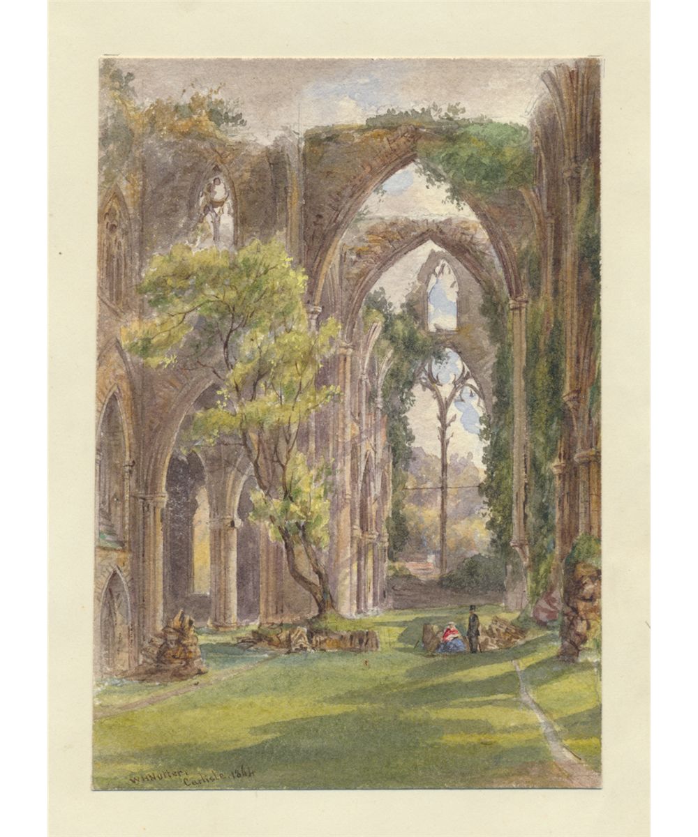 (1821-1872) English painter known for his landscapes. A fine original painting measuring 3 1/2" x 5" and titled "Tintern Abbey", signed at lower left adding date 1864. Mounted to a vintage album sheet and ready for display. Fine condition.