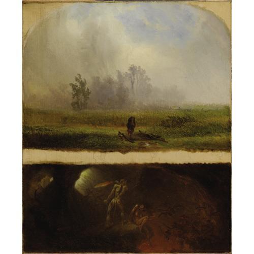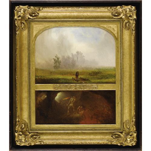 <B>WILLIAM HOLBROOK BEARD</B></I> (American 1824-1900)<BR><I>It Rains It Shines, The Devil Whipping His Wife</B></I><BR>Oil on canvas<BR>24 x 20 inches (61 x 50.8 cm)<BR><BR>Provenance:<BR>Private collection;<BR>Adelson Galleries, label verso (New York);<BR>Questroyal Fine Art, label verso (New York)<BR><BR>The author of this provocative nineteenth-century painting, William Holbrook Beard, was born into a family of portrait, animal, landscape, and genre painters in the small town of Painesville, Ohio, near Cleveland. He is best known for his satiric genre scenes featuring animals as stand-ins for human beings behaving badly. He frequently used bears as protagonists. The present work is less anecdotal, and more hauntingly compelling than many of his satirical works. In the upper scene, an innocent child has happened upon a peculiar wooden grate on the ground in a clearing of a misty field. Noises from below the strange construction attracted the child's attention and led him to kneel down and listen. In the lower, underground scene, which is rendered in an entirely different palette of earth tones and fiery furnace reds, Beard has painted a scene of a devil flogging his wife. Reminiscent of the work of Salvator Rosa, the subject is doubtless related to a literary source, but has a painterly rather than illustrational quality.<BR><BR>Basically self-taught, the young artist began his career painting with his older brother James Henry Beard, and then worked for several years as an itinerant portraitist in his home state. He moved to New York City in 1845, but by 1850 left the larger metropolis for Buffalo. There he established a studio and became close to a group of successful artists including portraitist Thomas LeClear (whose daughter he married) and Swedish-born landscapist Lars Gustave Sellstedt, Buffalo's principal mid-century painter. Beard remained in Buffalo until 1856, the year he left for a two-year tour of Europe. He traveled extensively, and met and painted with many American artists including Emanuel Leutze, Sanford Gifford, Worthington Whittredge, and Albert Bierstadt. Upon his return to the United States, he spent two more years in Buffalo before settling into apartments in the Tenth Street Studio Building in New York, home to many of the nation's most celebrated painters. After his return from Europe, Beard concentrated upon satirical animal subjects. As William Gerdts has noted, “One of his most characteristic and controversial of such paintings was his <I>March of Silenus</B></I> (Albright-Knox Art Gallery, Buffalo, New York), a classical theme reinterpreted with a drunken bear attended by an entourage of goats, which led to the artist's election as National Academician in 1862.”<BR><BR>In 1866, he traveled West by train to explore the landscape, and in Colorado his companion was Bayard Taylor, a writer and lecturer. During the trip, he wrote home to his wife that the landscape was monotonous, that he was disappointed in seeing so few buffalo, and the life out West was too hard. As a result of the trip, his wanderlust was sated, and he turned increasingly to his imagination as the source of inspiration for the habits and environments of his wildlife subjects. Many of his later paintings showed animals as physically realistic but atypical in terms of their behavior.<BR><BR> <B>Condition Report:</B> gentle inpainting located at the top of the composition associated with craquelure, otherwise in good condition, flecks of strengthening to areas - very minor - located in the bottom of the composition<BR><BR><b>Shipping:</b> Requires 3rd Party Shipping (<a target="_blank" href="http://www.heritageauctions.com/common/shipping.php">view shipping information</a>)