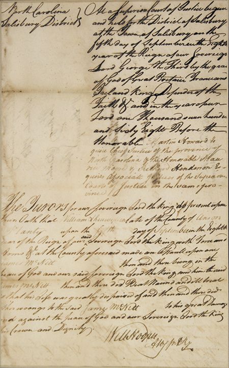 (1742 - 1790) American Revolutionary leader, a signer of the Declaration of Independence and a member of the Continental Congress (1774-77). D.S. "Will. Hooper" as attorney, with substantial portions of the document filled-out in Hooper's hand, 1p. legal folio, Salisbury, NC, Sept. 5, 1768, the complaint of planter William Shenwillen [?] of Anson County against James McNett, claiming that the latter: "...did Beat, Wound and ill treat [Shenwillen]...so that his life was greatly impaired of and then and there did other wrongs...to his great Damage and against the Peace of God and our Sovereign Lord...". Slight showthrough at center affects a few words of text, else very good.