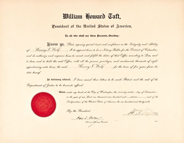 December 26, 1911-Dated, Partially-Printed Document Signed, “Wm H Taft” as President, 1 page, 19.25” x 15” at Washington, Choice Never Folded Crisp Near Mint. This being an official Presidential Appointment for Harry S. Wolf to serve as a “Notary Public for the District of Columbia.” Countersigned by Mr. Dawson, Acting Attorney General. Superb original Embossed Red Paper Seal is fully intact. This is a truly gorgeous Document, with a large 3” long bold brown signature. Simply a perfect, premium quality specimen for display.