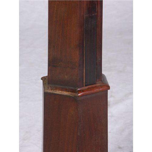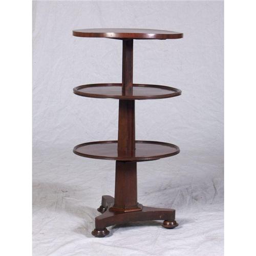 DUMBWAITER/TEA TABLE: One of a kind William IV circa 1830 English Hondurus mahogany three tier dumbwaiter/tea table, dumbwaiter calapses into tea table through a rope pulley action. top is old replacement, small veneer chipping, missing two small molding strips. 40''h (extended) x 22''diameter.
