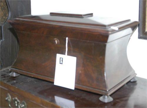WILLIAM IV MAHOGANY TEA CADDY, 15" long, fitted with two tea compartments, one with minor loss, lacking mixing bowl, circa 1830, PACKING AND SHIPPING (excluding insurance) $30,